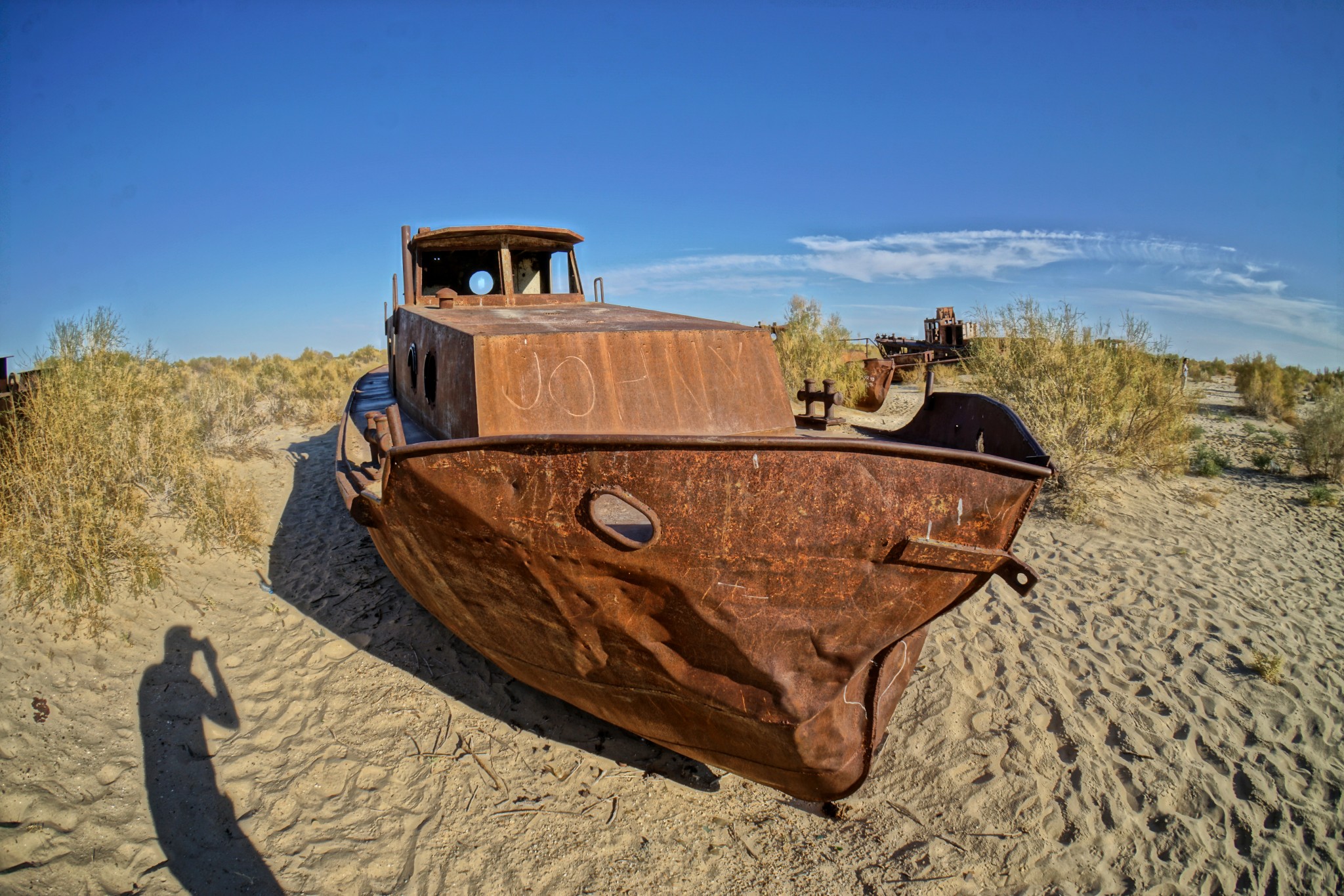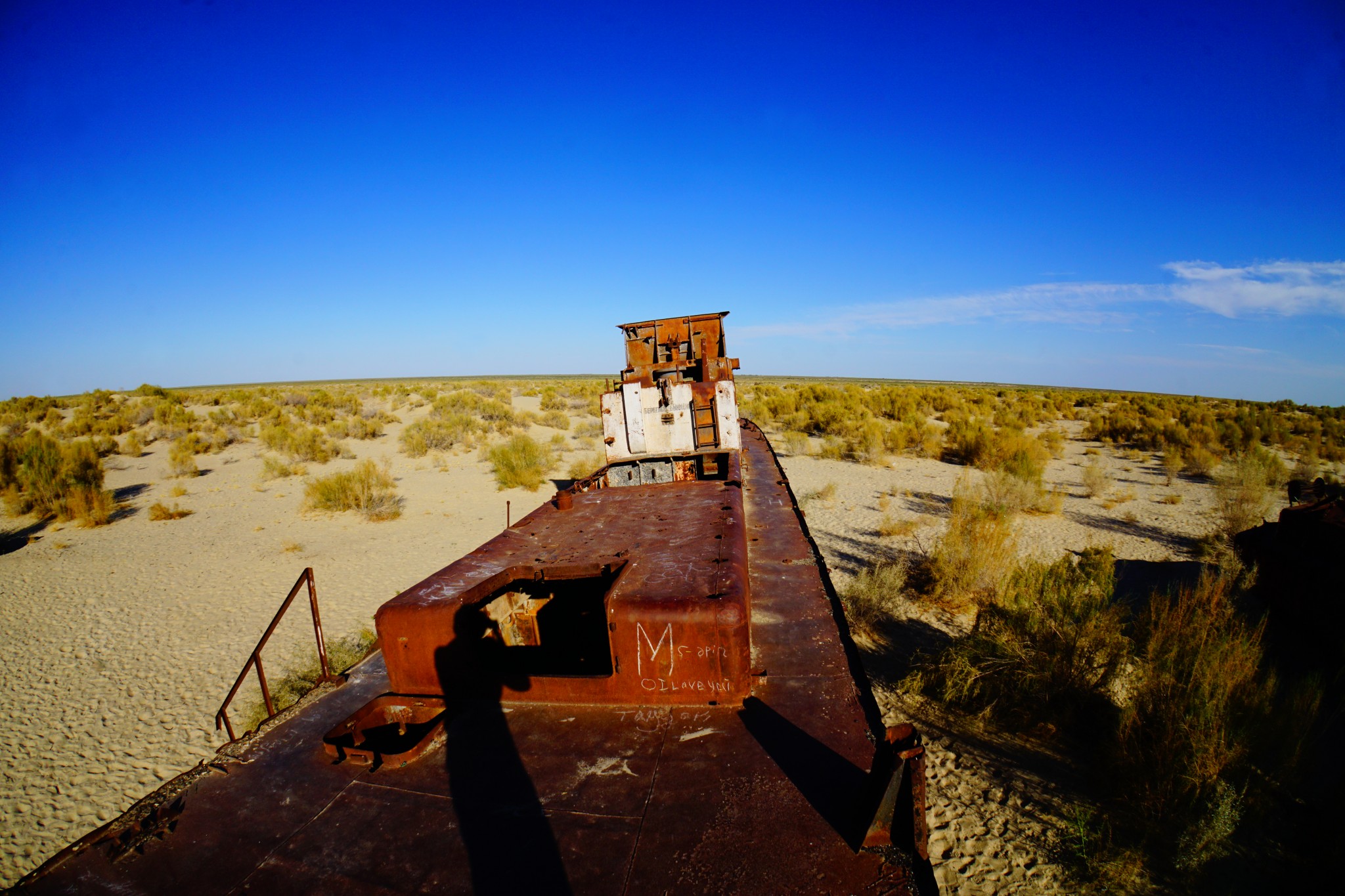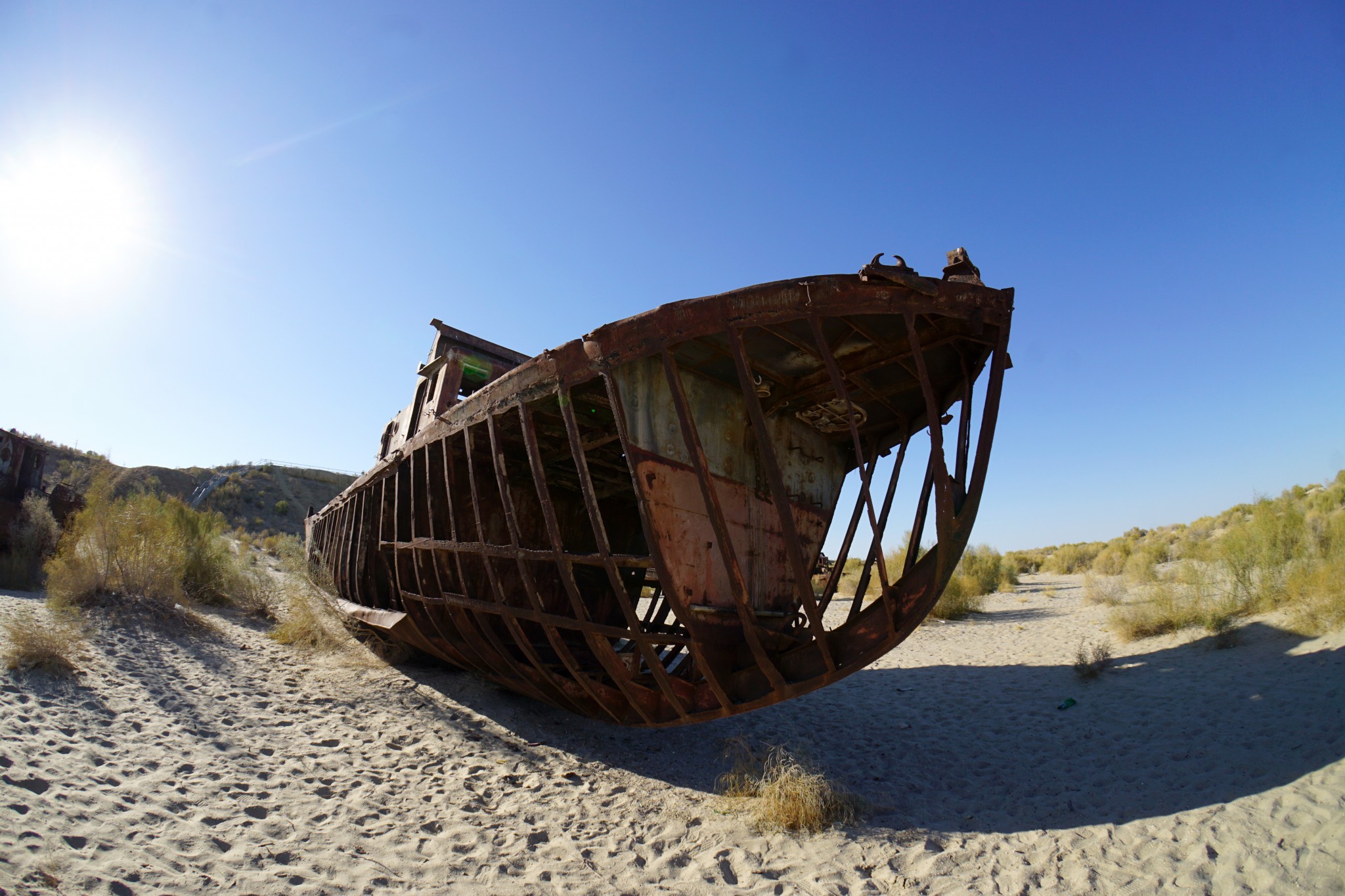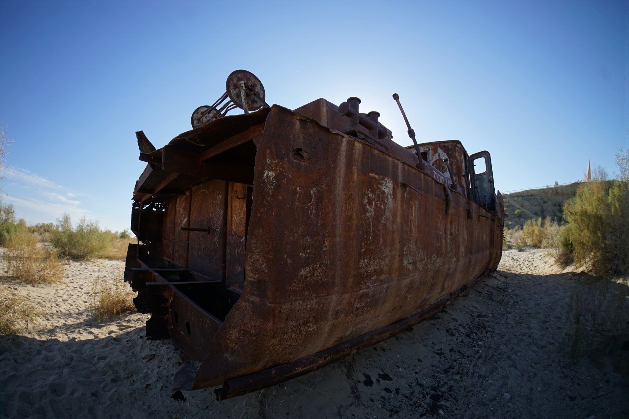 Pierwszą „atrakcją” jaką mieliśmy zobaczyć w Uzbekistanie było Morze Aralskie (tutaj obejrzysz odcinek jedź, BAW SIĘ+ na jego temat) – czy raczej to, co zostało z niego po uzbeckiej stronie. Na miejsce dostaliśmy się po stosunkowo długim czasie – najpierw musieliśmy wytargować cenę z taksówkarzami z Kungradu, którzy turystów widują raczej nieczęsto; a ponadto wymienić walutę na lokalnym bazarze. Po ponadgodzinnej jeździe na południe dotarliśmy wreszcie do miasteczka Moynaq, kiedyś będącego bramą do niegdysiejszego morza. Początkowe plany, żeby na miejscu nocować szybko zostały zweryfikowane, bo – poza rozrzuconymi po hipotetycznym dnie zbiornika wrakami – na miejscu nie ma praktycznie nic do zobaczenia. Zanim jednak zawinęliśmy się z powrotem do Kungradu, a następnie do Nukus, zrobiłem kilka zdjęć. Powiem tak – pomimo tego, że nad trupa Morza Aralskiego jedzie się długo i po BARDZO wyboistej drodze, to w żadnym wypadku nie żałuję nie tylko całej przeprawy, ale także tego, że specjalnie na tę okazję kupiłem tak zwane „rybie oko”. Sami zobaczcie, o co mi chodzi: