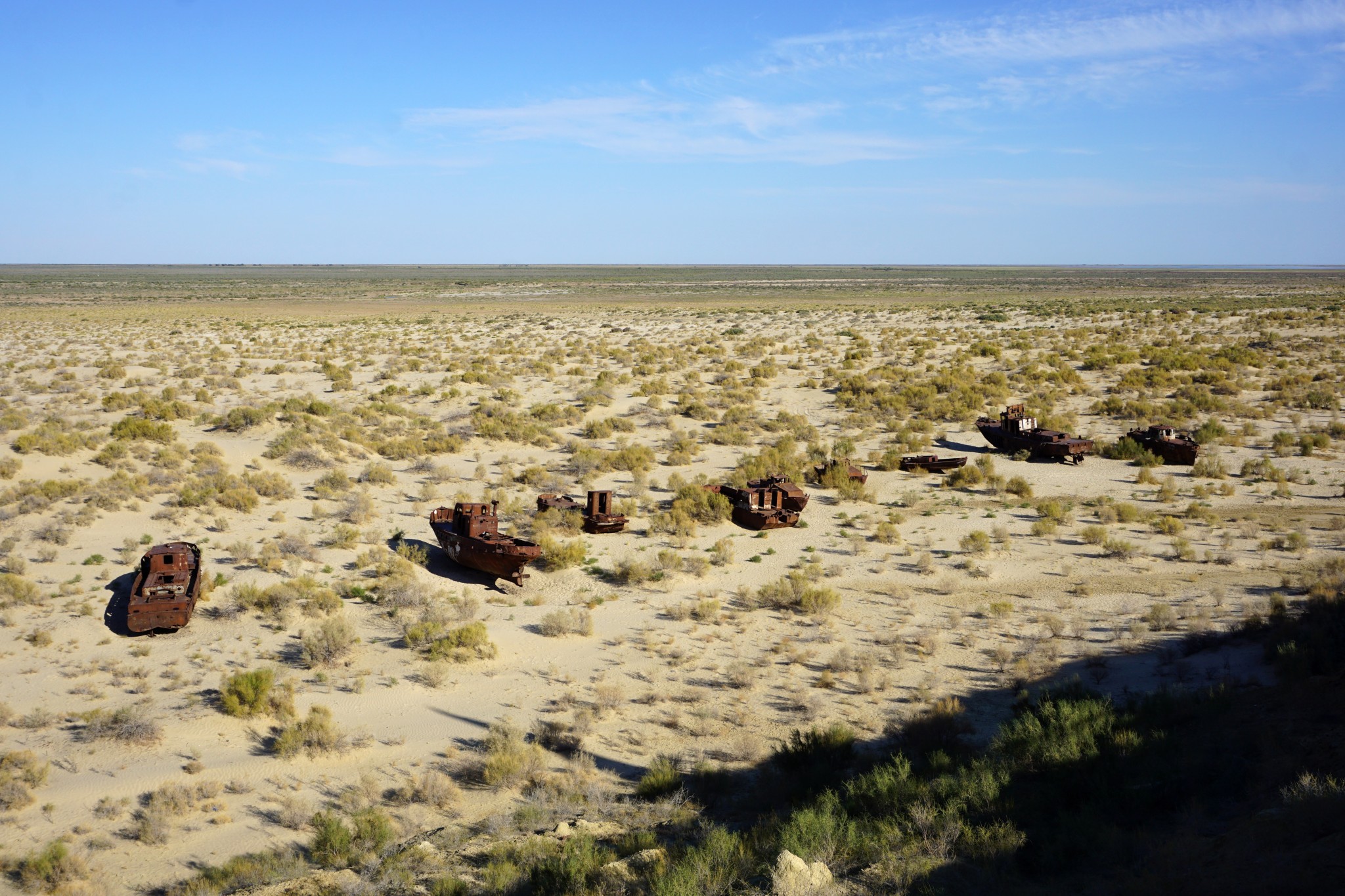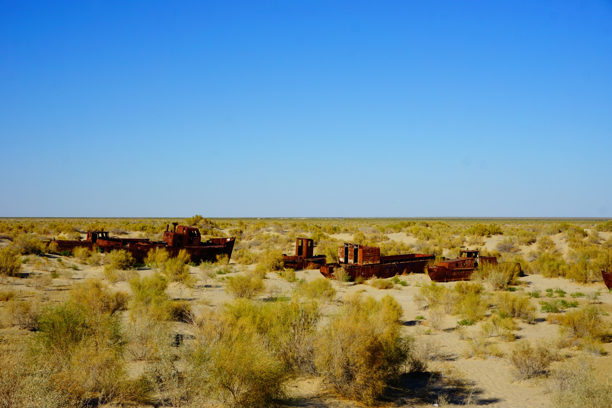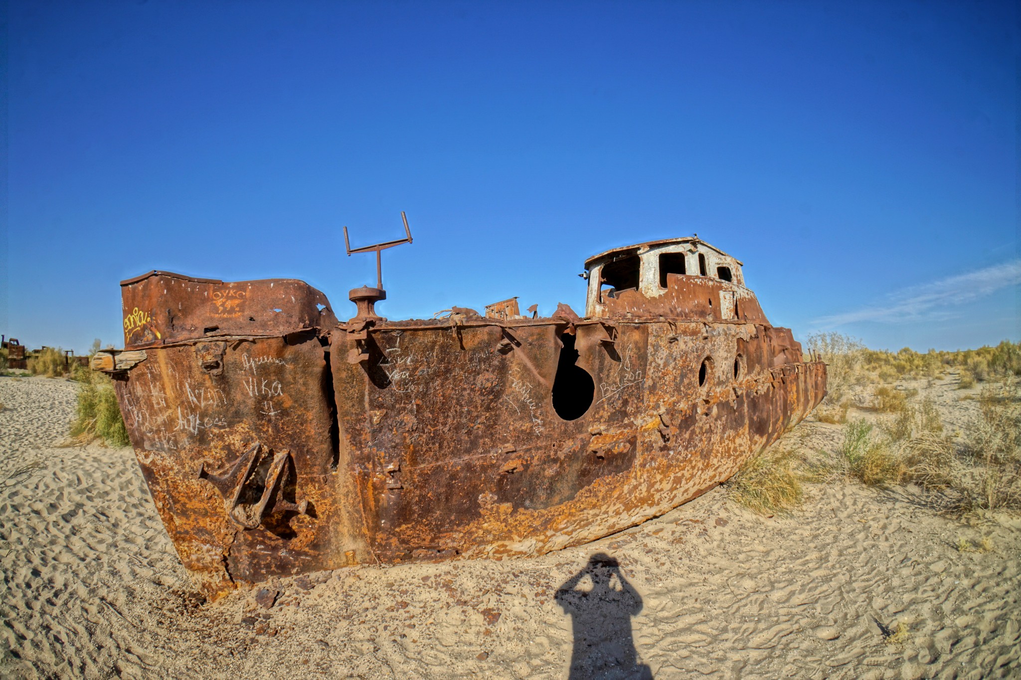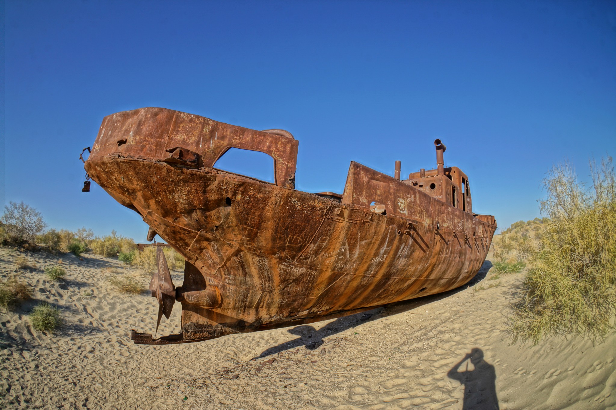 Pierwszą „atrakcją” jaką mieliśmy zobaczyć w Uzbekistanie było Morze Aralskie (tutaj obejrzysz odcinek jedź, BAW SIĘ+ na jego temat) – czy raczej to, co zostało z niego po uzbeckiej stronie. Na miejsce dostaliśmy się po stosunkowo długim czasie – najpierw musieliśmy wytargować cenę z taksówkarzami z Kungradu, którzy turystów widują raczej nieczęsto; a ponadto wymienić walutę na lokalnym bazarze. Po ponadgodzinnej jeździe na południe dotarliśmy wreszcie do miasteczka Moynaq, kiedyś będącego bramą do niegdysiejszego morza. Początkowe plany, żeby na miejscu nocować szybko zostały zweryfikowane, bo – poza rozrzuconymi po hipotetycznym dnie zbiornika wrakami – na miejscu nie ma praktycznie nic do zobaczenia. Zanim jednak zawinęliśmy się z powrotem do Kungradu, a następnie do Nukus, zrobiłem kilka zdjęć. Powiem tak – pomimo tego, że nad trupa Morza Aralskiego jedzie się długo i po BARDZO wyboistej drodze, to w żadnym wypadku nie żałuję nie tylko całej przeprawy, ale także tego, że specjalnie na tę okazję kupiłem tak zwane „rybie oko”. Sami zobaczcie, o co mi chodzi:
