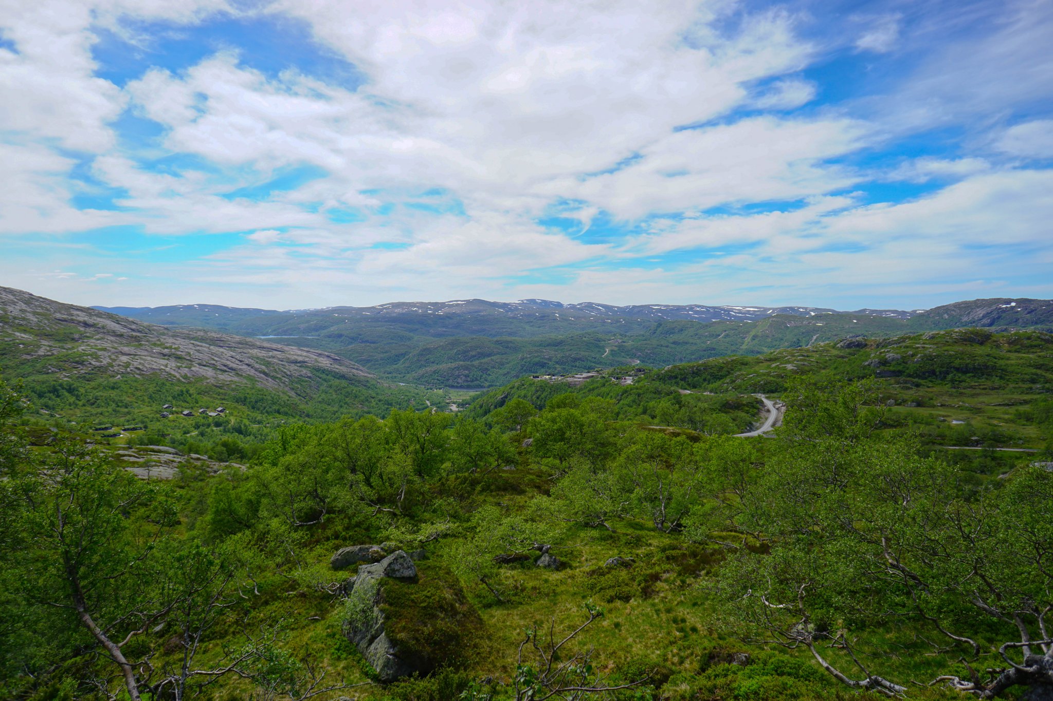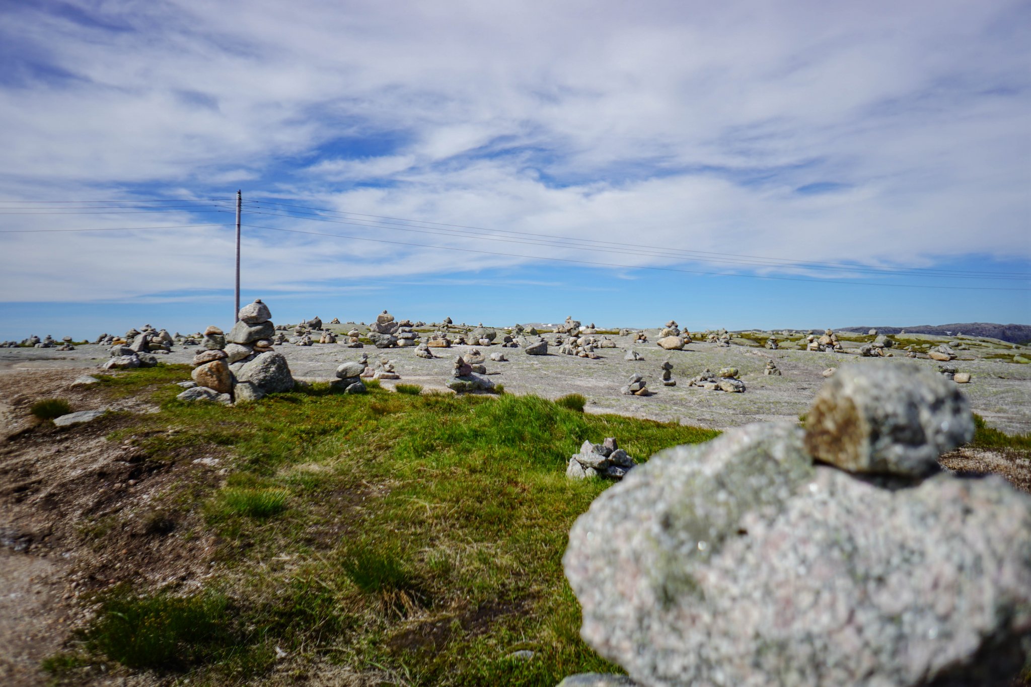 Jeśli chodzi o wyprawę na górę Kjerag, to przygoda zaczyna się dużo sporo przed nią – przynajmniej jeśli jedziemy na miejsce z okolic norweskiej riwiery. Malownicze, skalne krajobrazy są potwornie wręcz atrakcyjne, co dla naszej, nordtripowej grupy okazało się swego rodzaju przekleństwem. Fragment drogi z okolic Rosskreppfjorden aż do samego podejścia to istny fotograficzny raj. Co paręset metrów napotykamy miejsce, w którym po prostu trzeba się zatrzymać i cyknąć parę fotek. Chyba nie muszę mówić, że kiedy ma się na pokładzie praktycznie samych blogerów podróżniczych, taka trasa może być drogą przez mękę. Pierwszy śnieg widziany w lipcu? Przystanek. Malownicze jeziorko? Stop! Skalna równina rozciągająca się po horyzont? Stajemy! Stado owiec? Kolejne 30 minut pstrykania… I tak do usranej śmierci. Jeśli dodamy do tego jeszcze fakt, że i wcześniej jest gdzie się zatrzymać (weźmy chociaż zgrupowania tradycyjnych, norweskich domów z dachami porośniętymi trawą), to przejazd w okolice Kjeragu może zająć nie standardowe 3,5 godziny, a co najmniej drugie tyle.