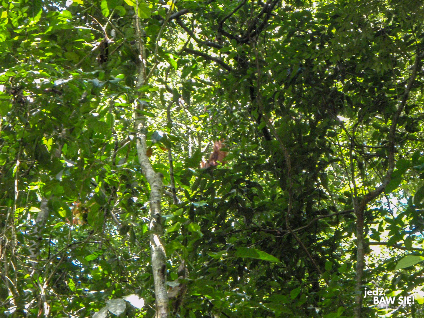 Niemal tracimy nadzieję na to, że zobaczymy orangutana, ale podczas krótkiego postoju na posiłek i gadkę o polityce, jeden z przewodników zauważa pomarańczowy kształt bujający się wśród drzew. Dorodna sztuka przemieszcza się majestatycznie niedaleko od nas, a my w panice chwytamy za aparaty, żeby zrobić chociaż jedno zdjęcie. Żadne z nas nie dysponuje porządnym sprzętem (2009, remember?), ale udaje nam się cyknąć kilka nieostrych fotek.