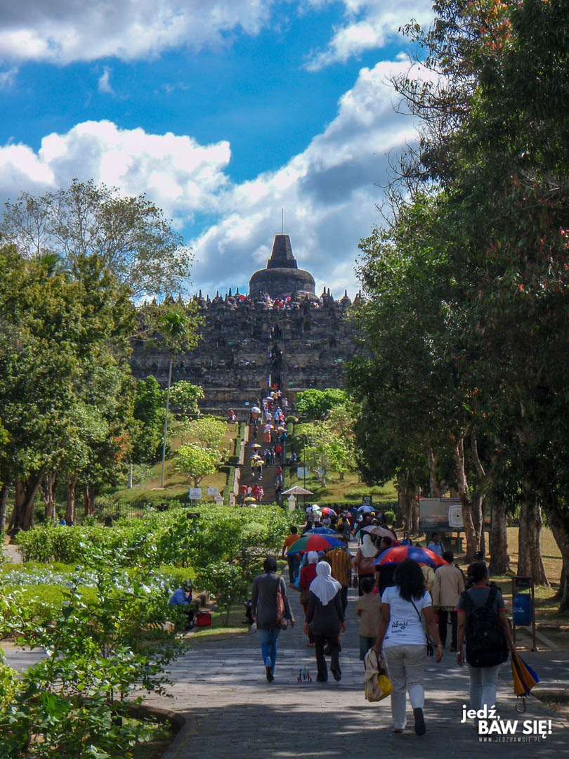 Borobudur najlepiej odwiedzić wcześnie rano albo wieczorem, kiedy na miejscu jest stosunkowo niewielu innych turystów. Świątynia jest najważniejszym zabytkiem w Indonezji (co nieco zakrawa na ironię, biorąc pod uwagę fakt dominującej w tym kraju religii), więc niemal codziennie trzeba się tu zmierzyć z hordami odwiedzających oraz handlarzy wszelkiej maści duperelami. Wstęp do świątyni jest płatny i – o ile mnie pamięć nie myli – w 2009 roku wynosił 15 dolarów (dla turystów zza granicy). Studenci płacili mniej, ale przy zakupie musieli okazywać jakieś potwierdzenie tego statusu, więc nie dało się władować za półdarmo na piękne oczy. Co ważne, parę lat temu obcokrajowcy musieli również wylegitymować się paszportem.