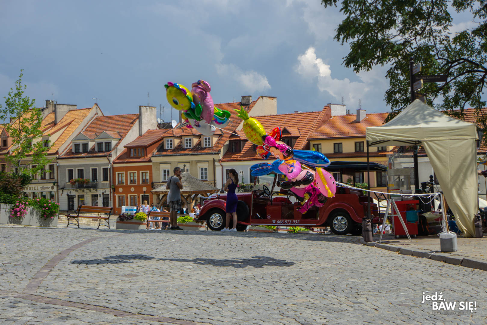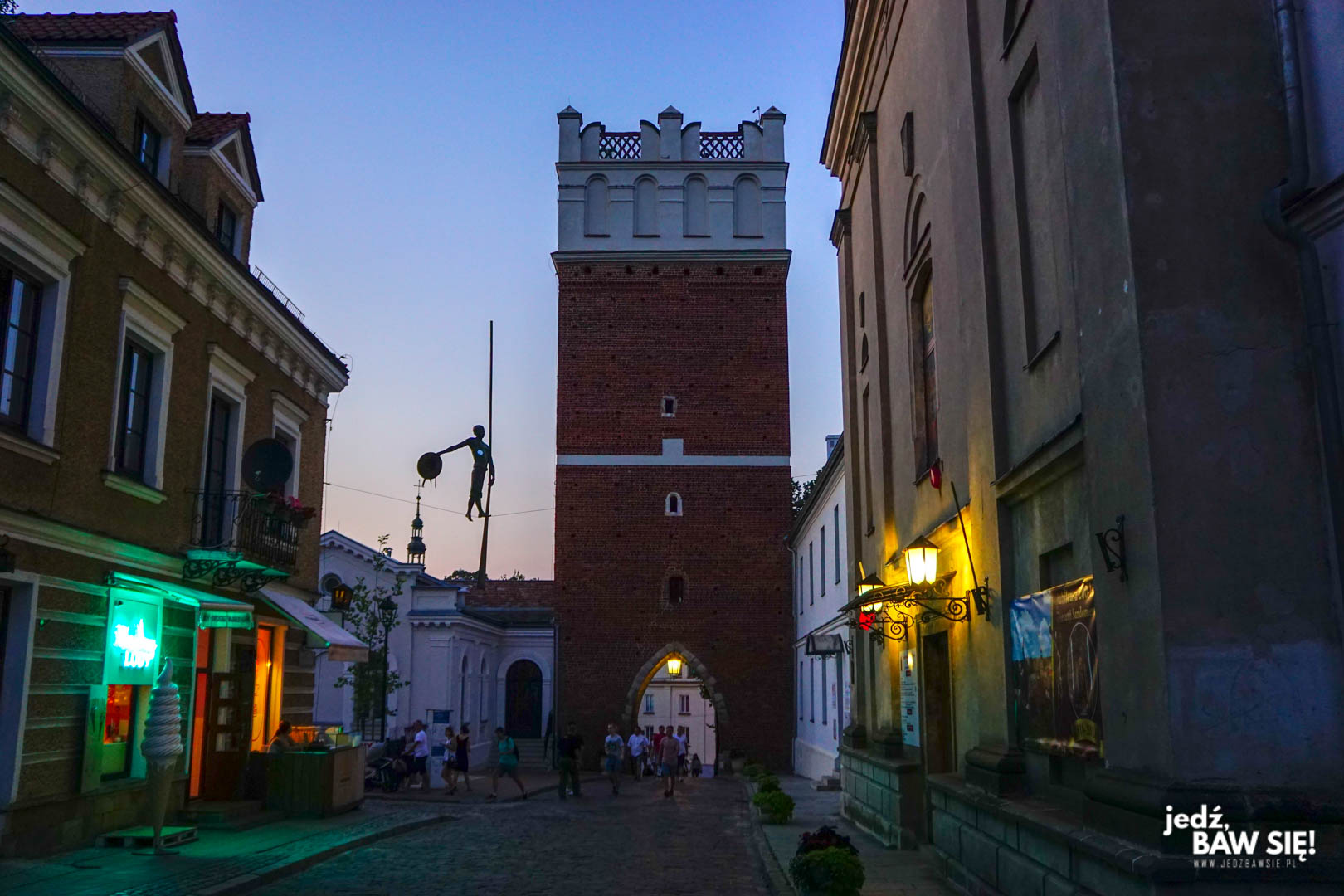 Rynek to rynek – wiadomo. Trochę kamieniczek, stojący nieco z boku ratusz, a do tego knajpy, bary, baloniki i cały ten kiczowaty, turystyczny syf. Niemniej, sandomierski rynek i okalające go ulice mają swój klimat. Sporą jego część tworzą dość niestandardowe instalacje artystyczne, z których jedną widzicie poniżej. Do tej pory nie bardzo wiem, jak ta rzeźba utrzymuje się na linie, niemniej efekt jest naprawdę interesujący.