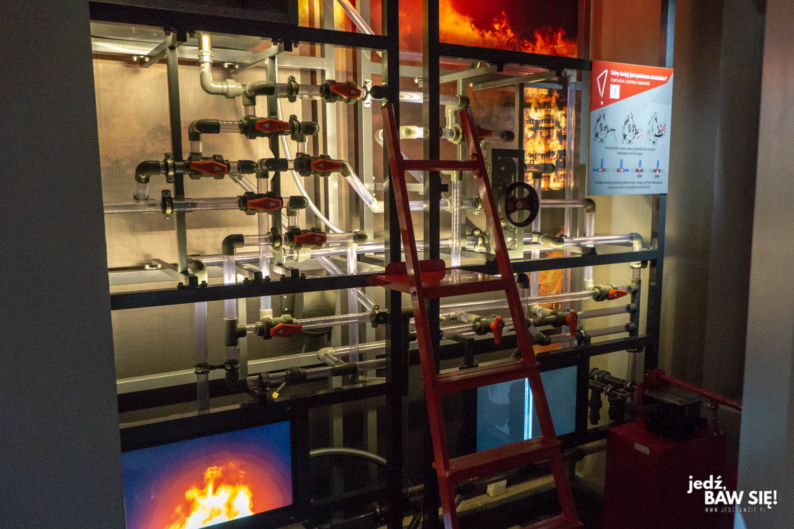 - Przez antyk i wieki średnie to kolejny rozdział historyczny, tym razem poświęcony walce z żywiołem. Poznamy tu historię rozwoju techniki gaśniczej, poczytamy o największych pożarach w historii, a na koniec samodzielnie ugasimy jego niewielką, elektroniczną odmianę. Tu miałem niewielki zarzut do instalacji multimedialnej, bowiem wkomponowana w nią pompa była dla mnie pewnym wyzwaniem siłowym. Nie sądzę, by kilkuletnie dziecko mogłoby sobie z nią poradzić, a przystawiona do atrakcji drabina sugerowała, że została ona stworzona także z myślą o młodszych odwiedzających.