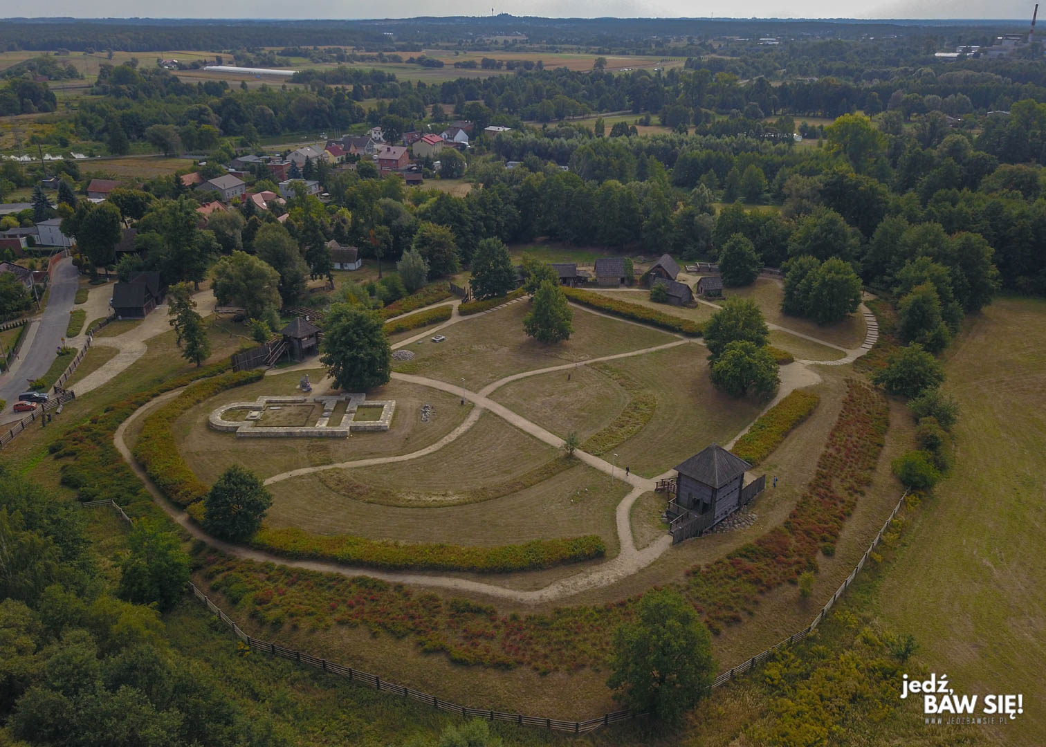 W grodzie obejrzymy sobie kilka odtworzonych, wczesnośredniowiecznych chałup, a młodsi uczestnicy wycieczki na pewno docenią obecność owiec, paru kóz oraz kurewsko nieśmiałego świniodzika. Dodatkowo, z jednej z dwóch drewnianych wież grodowych rozciąga się widok na pobliskie pola i łąki, chociaż trudno uznać go za zapierający dech w piersiach.