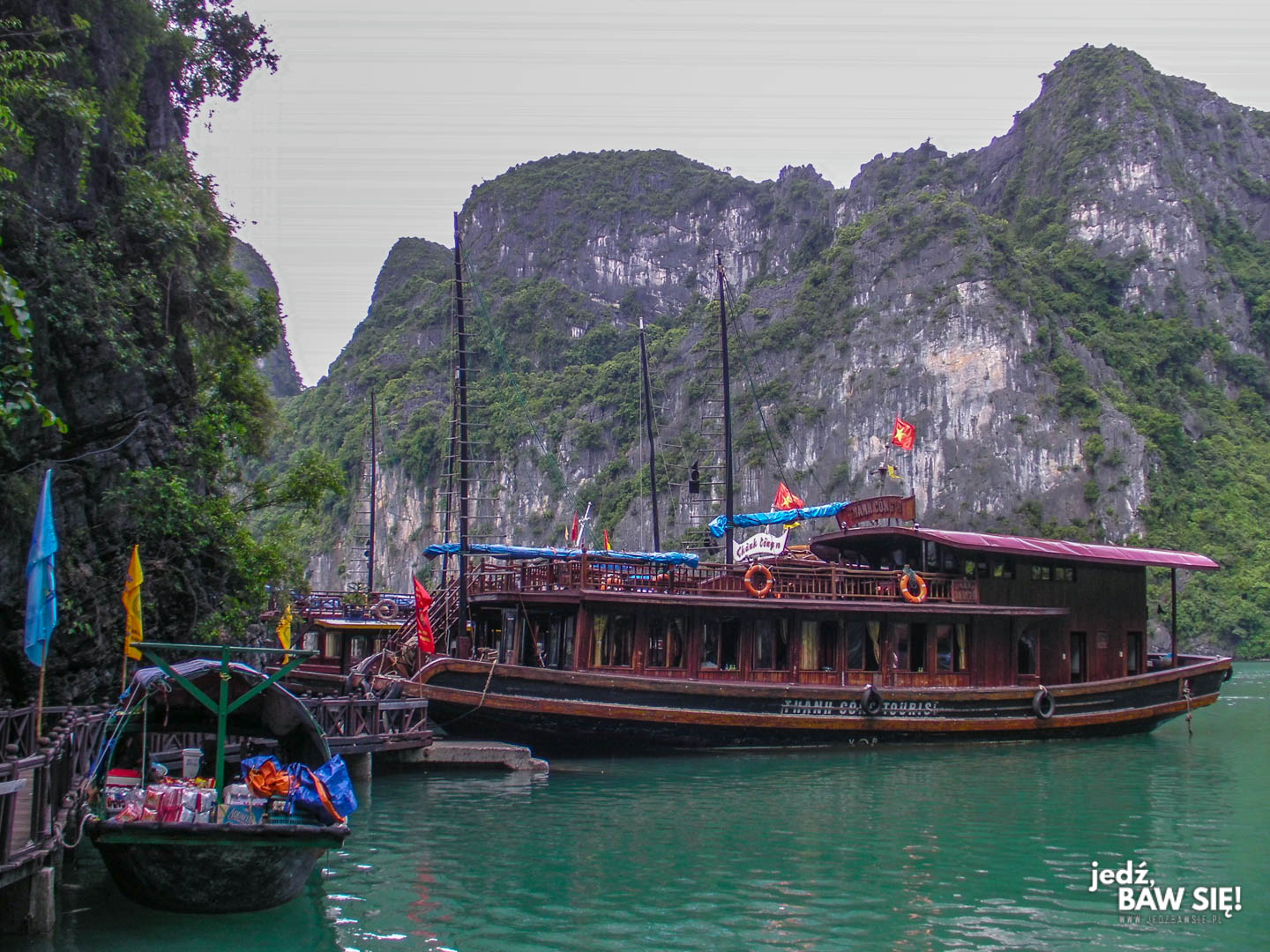Każda noclegownia w Cat Ba w ciągu kilku minut zorganizuje Wam przynajmniej jednodniowy wypad do zatoki Ha Long. My, o ile mnie pamięć nie myli, dogadaliśmy się z jedną z firm turystycznych sąsiadujących z naszym hotelikiem, a jednodniowy rejs wyciągnął nam z kieszeni 17$/osoby. Dziś będzie to zapewne więcej, aczkolwiek i tak zaznaczę, że – z racji na nasz status majątkowy – niska cena odgrywała w naszym przypadku dość znaczną rolę. Oczywiście, na pływającą wycieczkę po Halong można wydać praktycznie nieskończoną kwotę – możecie na przykład wyprawić się na nią chińską dżonką albo luksusowym statkiem, na którym co godzinę będą Wam serwować owoce morza oraz drinki wliczone w cenę. Nasz wariant był zdecydowanie mniej wypasiony, aczkolwiek wciąć zawierał posiłek, który zresztą okazał się całkiem niezły.