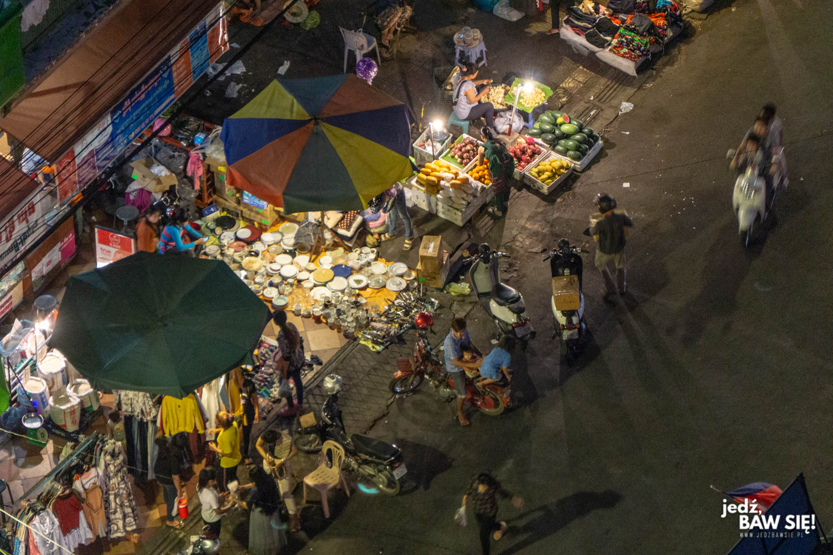 Postarzane antyki i pamiątki? Pierwsza alejka. Ciuchy znanych marek, przywożone tutaj wprost z fabryk, w których są produkowane (słynne „spadło z TIRa” zmienia się w Kambodży w „spadło z linii produkcyjnej”)? Aleje trzecia i czwarta. Świeże warzywa? Ostatnie alejki, w które lepiej nie zapuszczać się za daleko, bo znajdziemy tam także świeże mięso i ryby, a nie każde nozdrza dobrze to przyjmą. Elektronika – w tym „oryginalne” DVD z całymi sezonami seriali, słuchawki Bose za 15 dolców czy cała gama głośników JBL, w kształtach, których nie przewidział nawet dział produkcyjny marki, wypłynęła na zewnętrzną ścianę Targu, bo tego turyści szukają w pierwszej kolejności. Moje słuchawki nadal grają, a sprzedawczyni z ogromną cierpliwością i znawstwem otwierała kolejne opakowania, szukając takich, które łaskawie połączą się z moim niepopularnym telefonem.