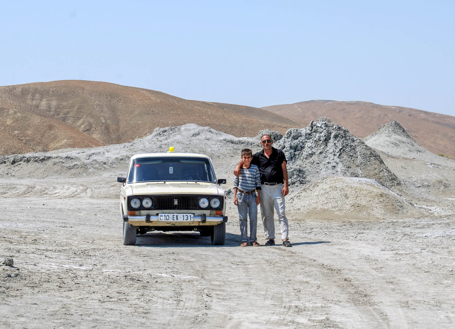 Pierwszym przystankiem na naszej qobustańskiej trasie były „słynne” wulkany błotne. Znów cudzysłów, albowiem podczas naszej wizyty w tym miejscu nie było absolutnie nikogo innego, dzięki czemu całą bulgoczącą rodzinkę mieliśmy tylko dla siebie.