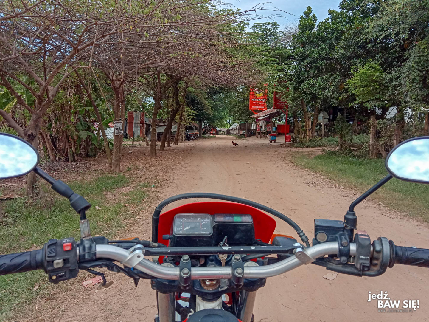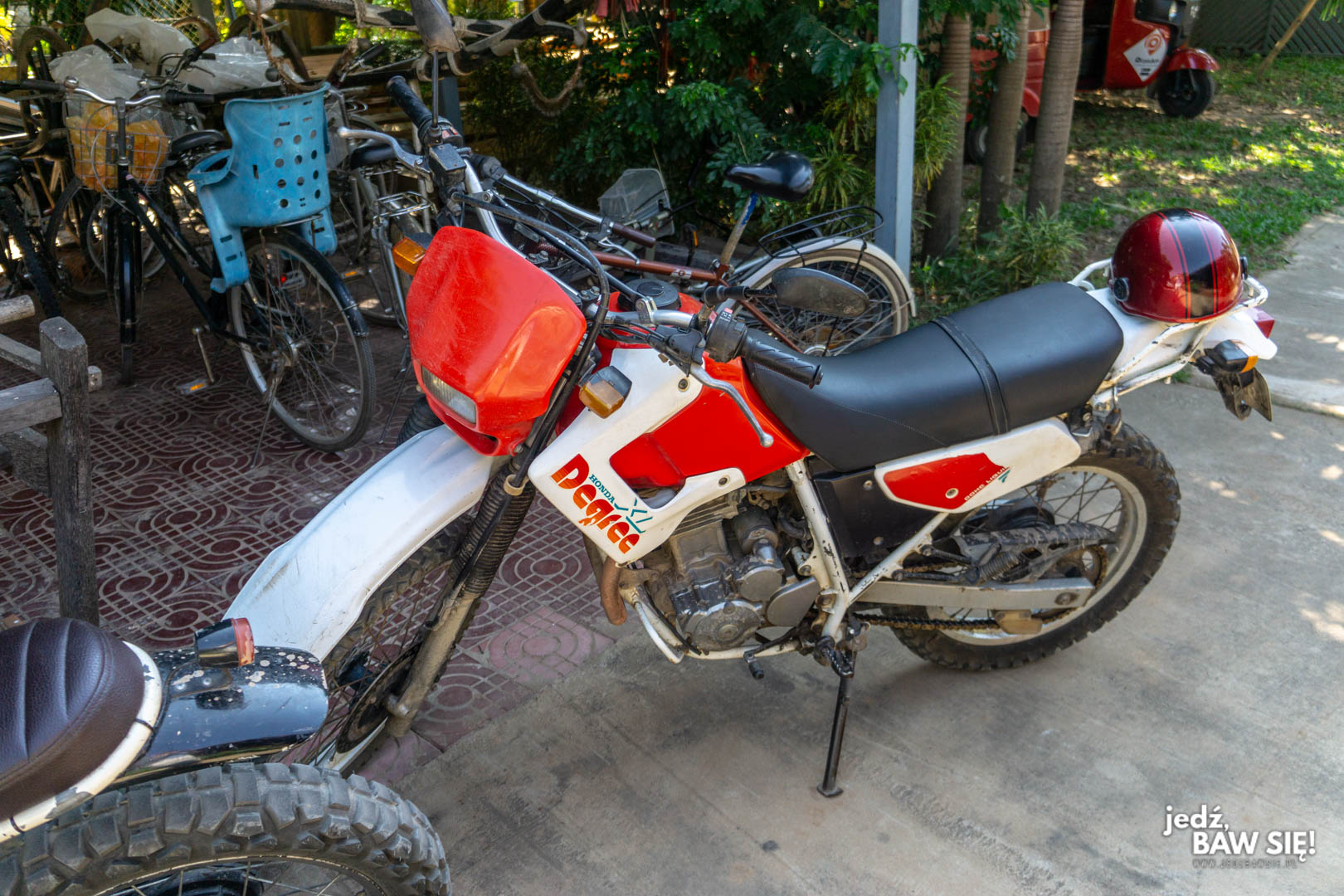 Najtrudniejszą częścią procedury wynajęcia motocykla w stolicy Kambodży jest… znalezienie zaufanego usługodawcy. Na miejscu wcale nie jest ich aż tak dużo, a oferowane przez nich maszyny są różnej jakości. Mi kazano zawierzyć firmie Lucky Lucky Moto, ulokowanej na #413Eo, Monivong Blvd. Lokal rzuca się w oczy, bo stoi przed nim od groma jednośladów, w tym także ten typ, na którym najbardziej mi zależało – terenowe Hondy Degree o pojemności 250 cc. Większe maszyny prawdopodobnie również są dostępne, ale wierzcie mi, że jeżdżenie wielkopojemnościową bestią po kambodżańskich drogach może szybko skończyć się ślizgiem na piasku. Stan motocykli przeznaczonych na wynajem nie jest oczywiście najwyższy, ale przez dzień czy dwa nic nie powinno Wam nawalić czy odpaść. Będziecie zadowoleni, o ile nie jesteście zbyt wybiórczy podczas sprawdzania stanu lakieru.