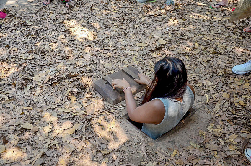 Do tuneli możemy oczywiście wejść sami, ale to doświadczenie jest kilkukrotnie bardziej klaustrofobiczne niż w przypadku wcześniej odwiedzonych przez nas tuneli Vinh Moc. Tam przynajmniej czasem można się było wyprostować, podczas kiedy po większości tuneli w Cu Chi trzeba poruszać się w kucki, co siłą rzeczy wymusza na turyście szybkie wyjście na powierzchnię.