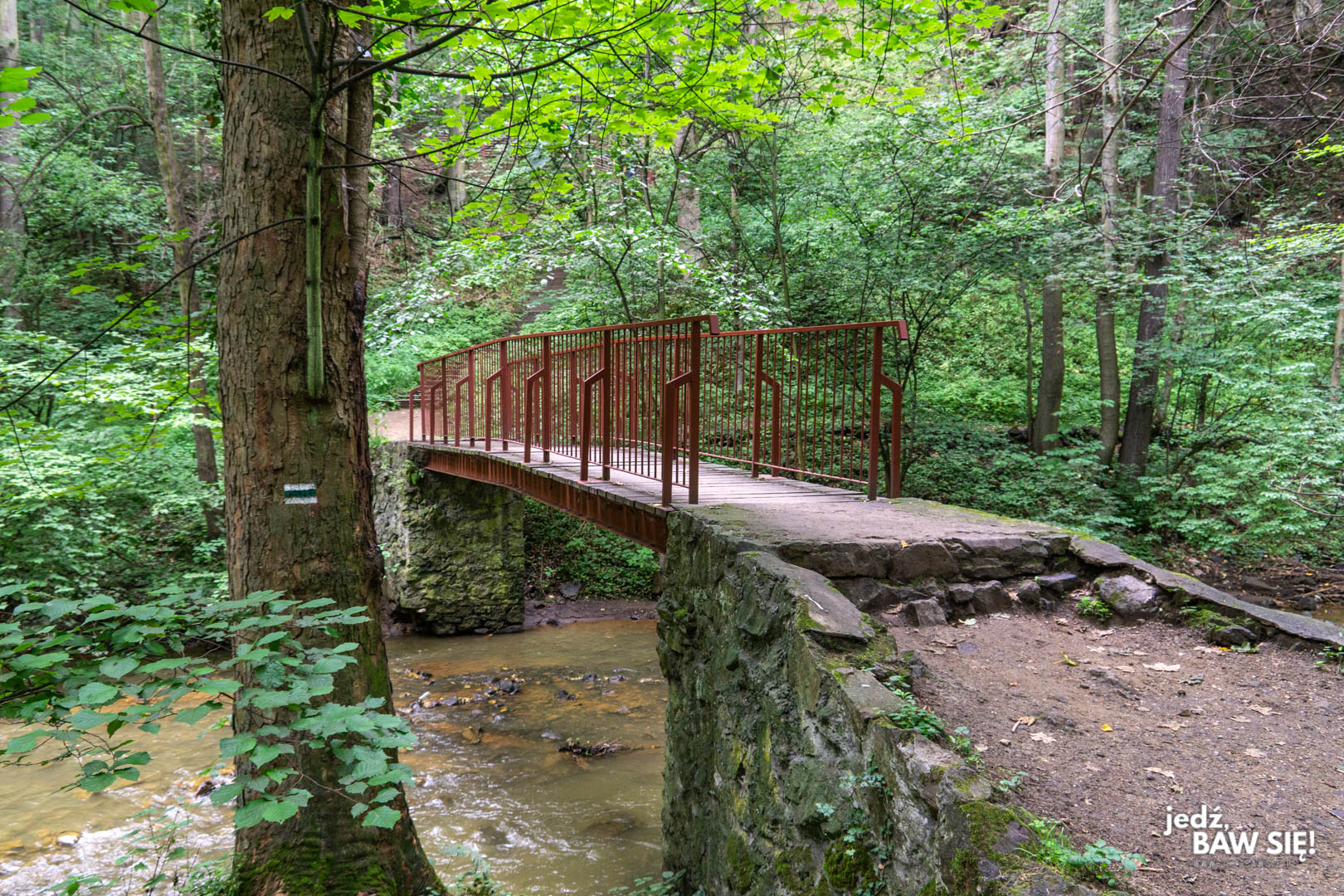 Ciągle patrząc na mapę na komórce, doszliśmy do wniosku, że musimy wybrać odnogę zmierzającą w dół. Tu zaczęły się pierwsze schody, bo ścieżka była dość stroma (a na pewno nieco zbyt stroma jak na obuwie, które mieliśmy) – na tyle, że nie polecałbym schodzenia nią w deszczową pogodę. Agatka zaczęła już nieco narzekać na bolące biodro, ale dzielnie parliśmy naprzód. Zdecydowaliśmy również, że raczej nie będziemy wracać tą samą drogą, z racji na jej męczące nachylenie. Po kilkunastu minutach doszliśmy wreszcie do kolejnego charakterystycznego punktu, jakim był mostek na rzeczce Pełcznicy.