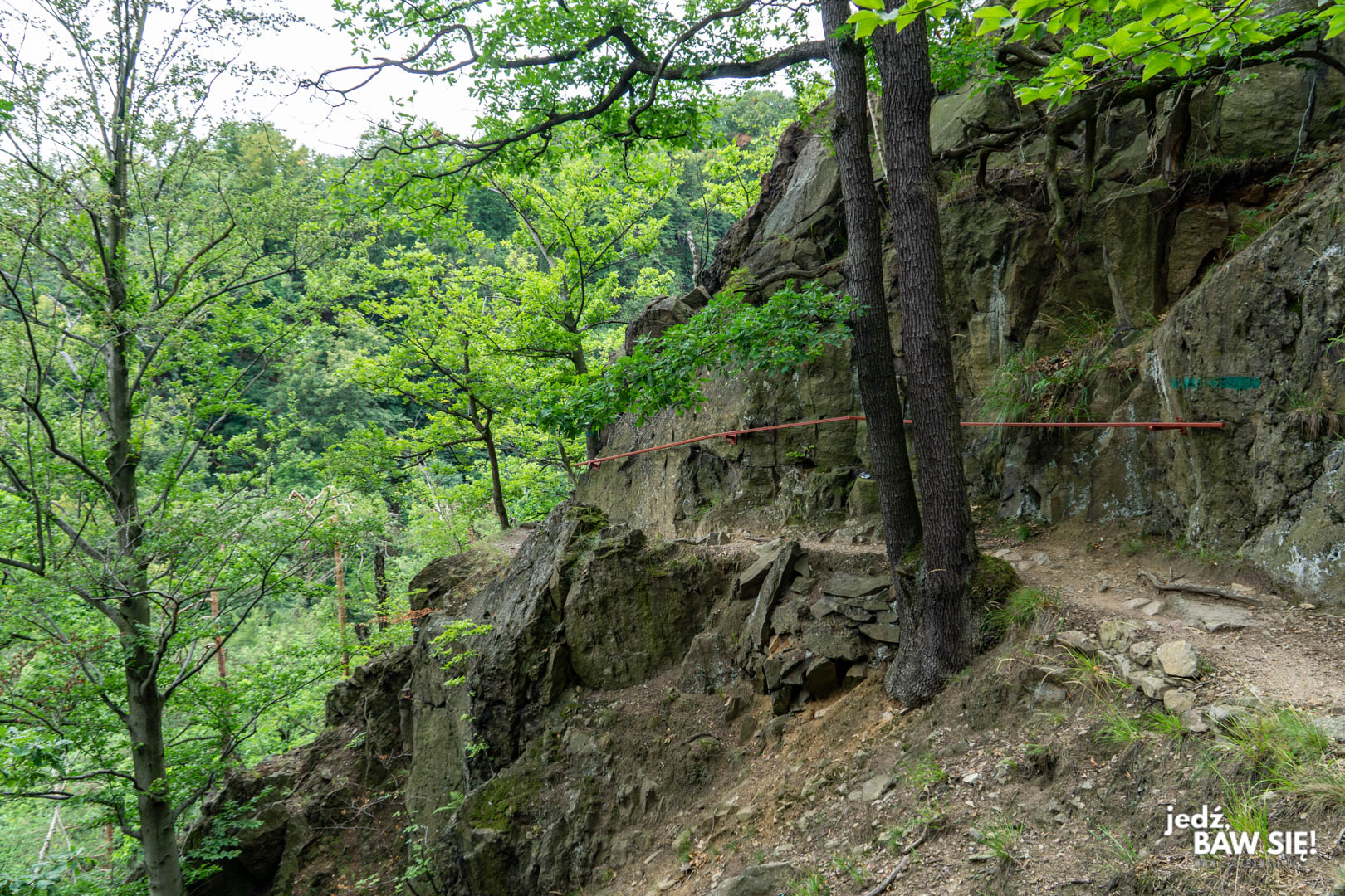 Początek nieco nas przestraszył, ale byliśmy dobrej myśli. Z punktu widokowego zeszliśmy ledwo widoczną ścieżką skalną, odchodzącą z niego na lewo (jeśli stoimy twarzą do bryły zamku Książ). Już na samym początku Agatka narzekała, że ma nieodpowiednie obuwie (moje zresztą nie było wiele lepsze), ale postanowiliśmy chwilowo zignorować ten fakt w imię lepszej sprawy.