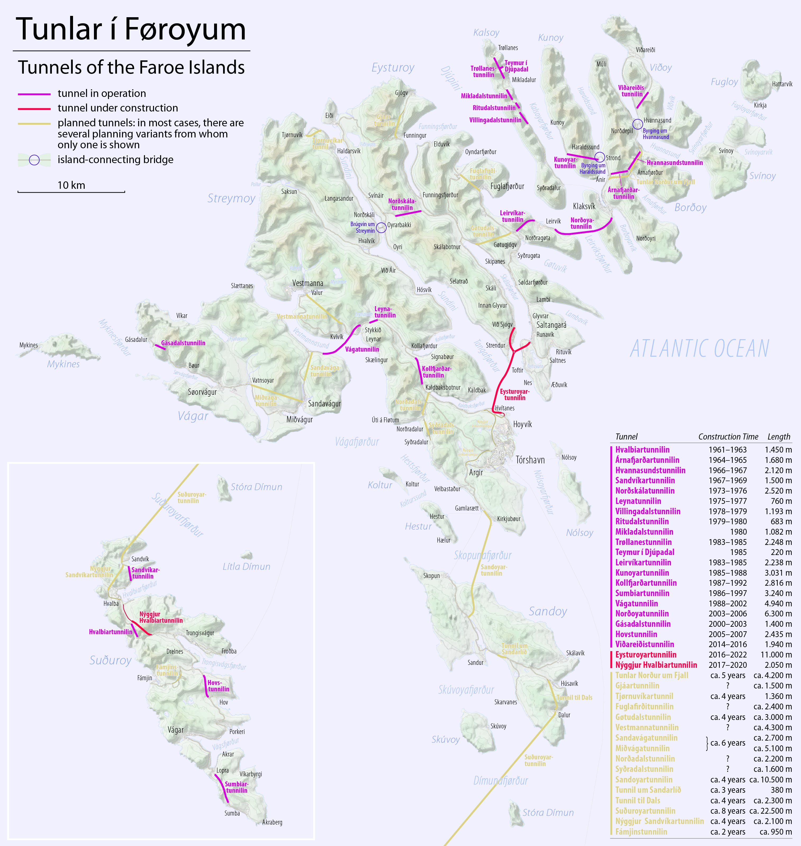Tunele to kwestia, która budzi najwięcej obaw wśród kierowców wybierających się na Wyspy Owcze. Przeróżne miejsca archipelagu połączone są – jak na razie – aż 20 tunelami, z czego dwa biegną pod morzem. Kolejne 18 (sic!) tuneli ma zostać przekopanych przez Owce do 2025 roku, a w planach jest między innymi podmorskie połączenie wysp Streymoy, Sandoy i Suduroy (obecnie na dwie ostatnie dostaniemy się wyłącznie promem). Mapę obecnie funkcjonujących i planowanych tuneli możecie zobaczyć poniżej.