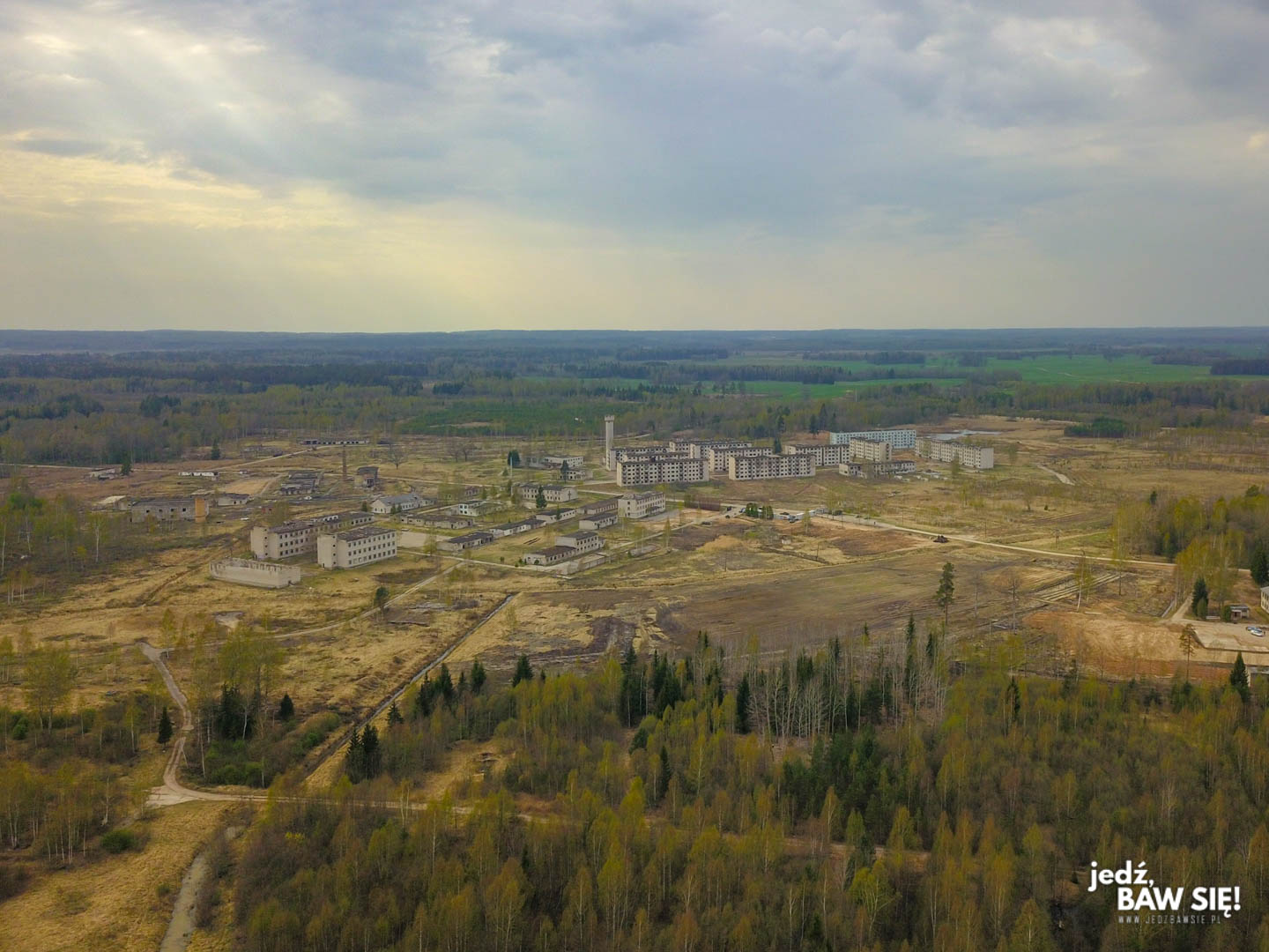 Jeśli sami chcielibyście zobaczyć Skrundę-1 choćby z oddali, to dobry punkt obserwacyjny znajduje się kawałek na południe od niej. Duża polana pozwoliła mi nawet podnieść drona, chociaż nie odważyłem się podlatywać nim zbyt blisko ruin – cholera wie, czy nie zwaliłbym nam na głowę jakichś wojskowych.