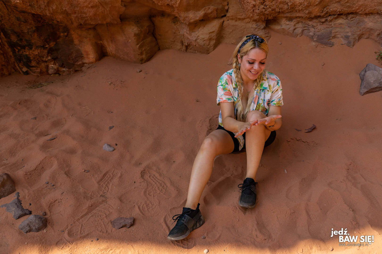 Na Wadi Rum praktycznie nie ma ograniczeń co do stroju (oczywiście nie mówię o chodzeniu w bikini). Krótkie szorty i t-shirt sprawdzą się idealnie podczas krótszych spacerów. Z racji na to, że na większe odległości przemieszczaliśmy się tam na pace jeepów (co było chyba moją ulubioną rozrywką), to – ze względów higienicznych – miałam wtedy na sobie obcisłe getry do kolan. Z kolei chłodniejszymi wieczorami wystarczył zwykły dresik z długim rękawem i takimi samymi nogawkami.