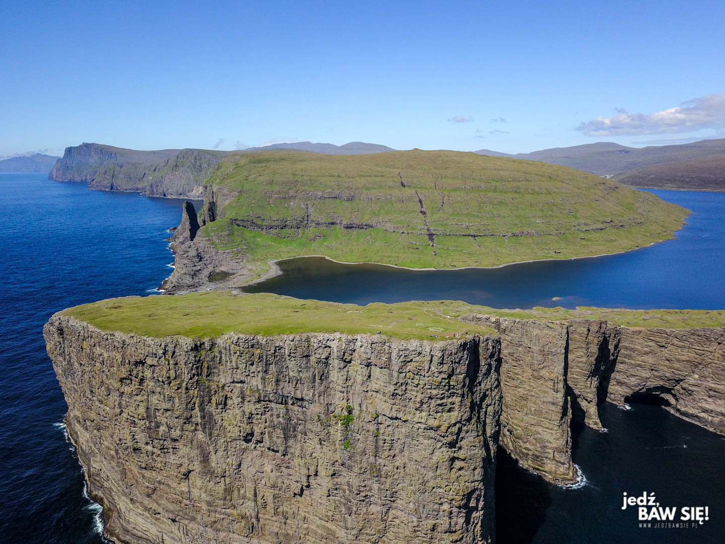 Spacer brzegiem 6-kilometrowego jeziora Leitisvatn (zwanego także Sorvagsvatn albo Vatnid, czyli po prostu Woda) to jeden z najciekawszych, luźnych trekkingów, jakie można odbyć na Wyspach Owczych. Przez większość spaceru będziecie podziwiać samo jezioro (podobno wyjątkowo obfite w ryby), ale jego finał zaskoczy Was na wysokim (142 m), skalnym klifie Traelanipa, z którego roztacza się jeden z najlepszych widoków na Farojach (i z którego w dawnych czasach sympatyczni Wikingowie zrzucali niezdatnych do pracy niewolników). W dobrą pogodę widać z niego nawet wysepkę Litla Dimun, znaną z dziwacznej pokrywy chmur, która utrzymuje się nad nią przez większość czasu. Spacer na kraniec Traenalipy powinien zająć Wam około godziny z kawałkiem, ale nie ma się co spieszyć – serio.