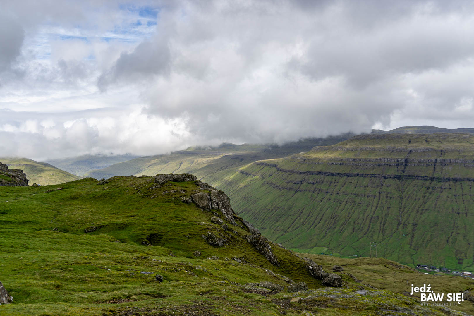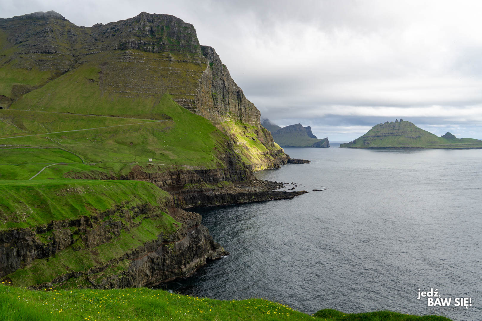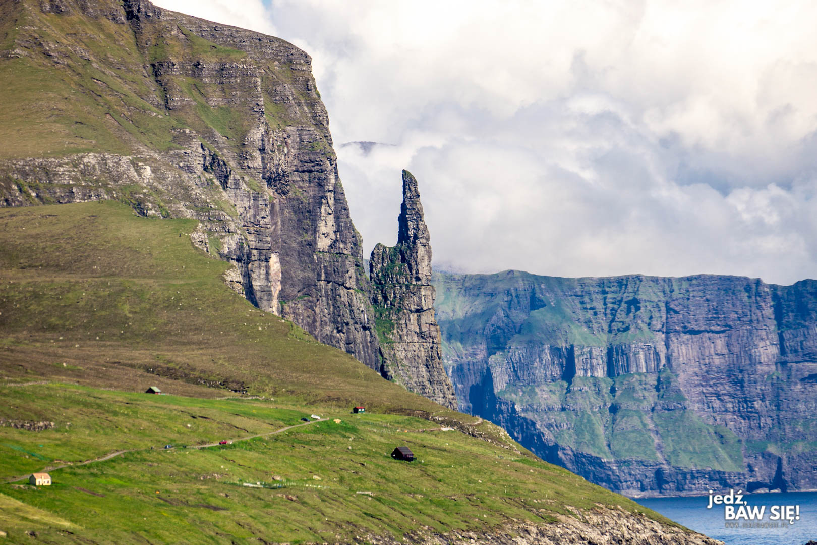 Powyższy widok można obejrzeć właściwie z każdego punktu na trasie pomiędzy wioskami Bour a Gasadalur (patrz niżej), ale najlepiej zatrzymać się w pobliżu niewielkiego wodospadu Skardsafossur, kawałek przed tunelem prowadzącym do Gasadalur. Na klif trzeba podejść pieszo, ale hej – w końcu jesteście na Wyspach Owczych.