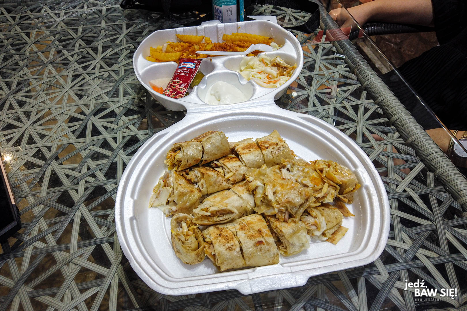 Rozwiązanie jest dość proste. Zamiast dawać się codziennie kusić kolorowym szyldom i naganiaczom (choćby tym na Rainbow Street w Ammanie), poświęćcie trochę czasu na eksplorację bocznych uliczek i knajp, w których jada głównie lokalna ludność. W każdym, nawet najmniej turystycznym mieście znajdziecie choćby popularne lokale serwujące falafele lub shoarmę (czyli wariację na temat kebaba). Najpopularniejszym wariantem jest baranie mięso zawinięte w cienkie ciasto przypominające tortillę. Tak przygotowana potrawa cięta jest następnie na mniejsze porcje i serwowana wraz z frytkami i bukietem surówek. Za dwa takie „wrapy”, zapakowane do jednego pojemnika, zapłacicie najczęściej nie więcej niż 2 JOD (czyli około 10 zł), a najecie się nimi pod korek, niejednokrotnie zostawiając nadmiar frytek. Dla porównania, za „standardowy” posiłek w restauracji turystycznej nie zapłacicie mniej niż 5-7 JOD od osoby, a głupi hummus będzie tam kosztował circa 2 JOD.