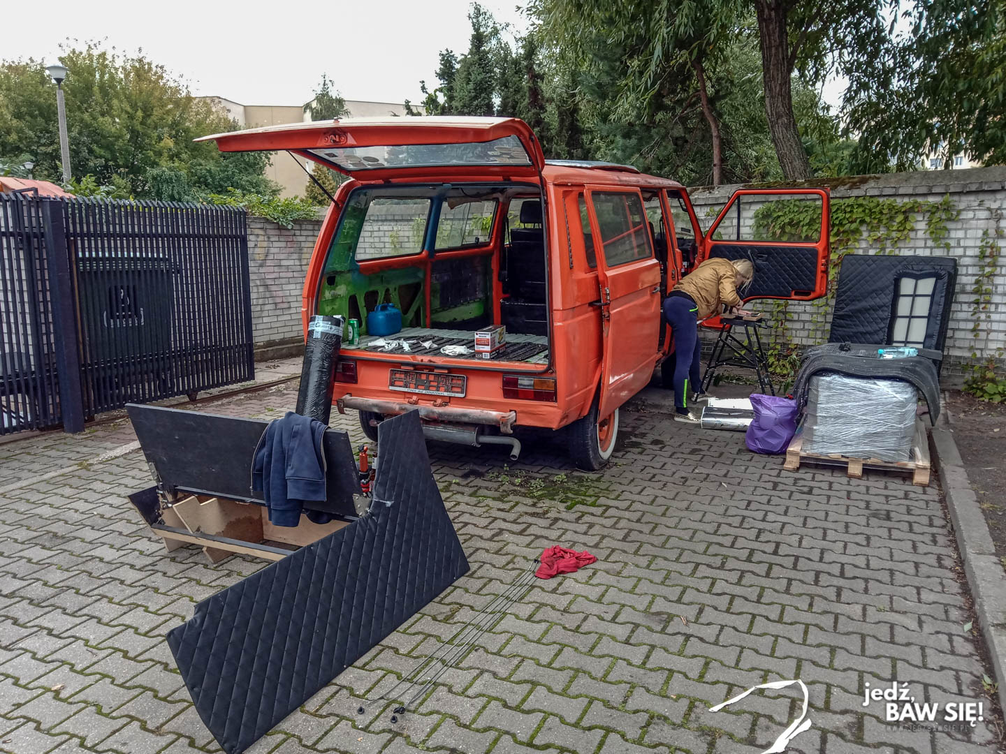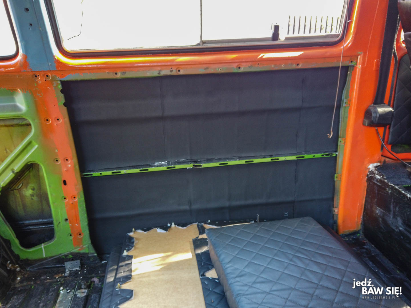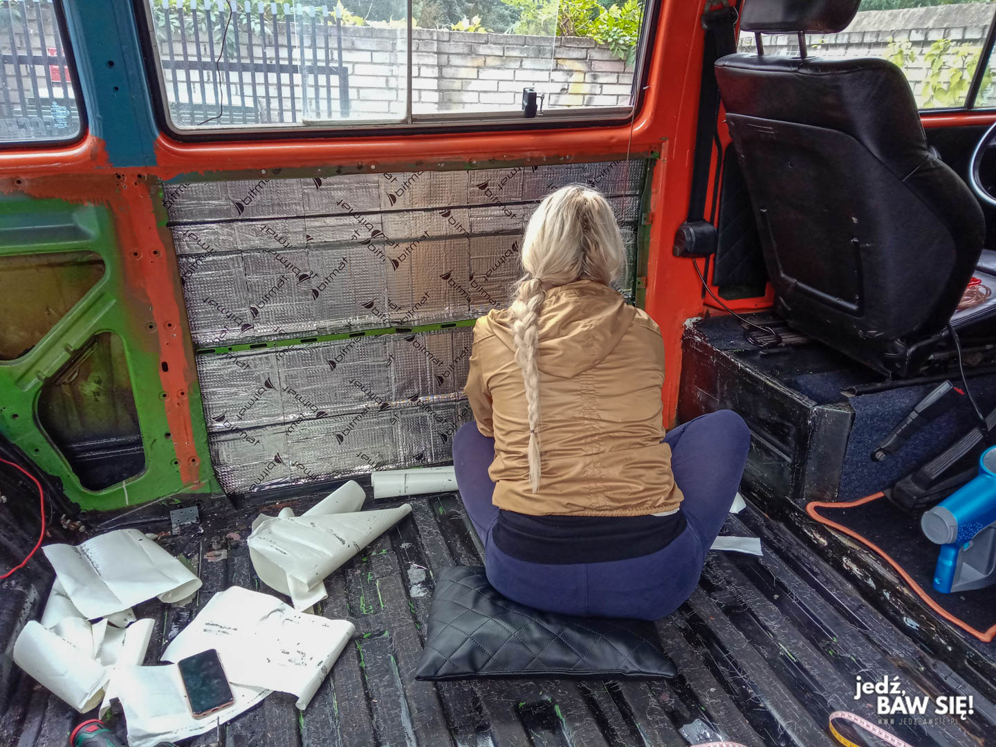 Po wyczyszczeniu auta zajęliśmy się natychmiastowym burzeniem efektu naszej ciężkiej pracy, to jest ponownym, tym razem solidnym wygłuszeniem i (częściowo) izolacją termiczną paki. Wygłuszenie w naszym busie jest o tyle ważne, że – przynajmniej na razie – jego sercem jest oldschoolowy silnik diesla, znany z dość dużej głośności pracy.