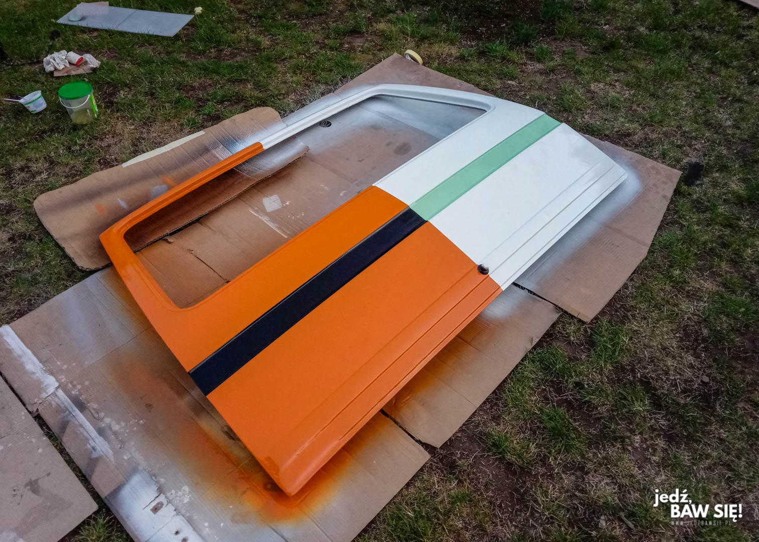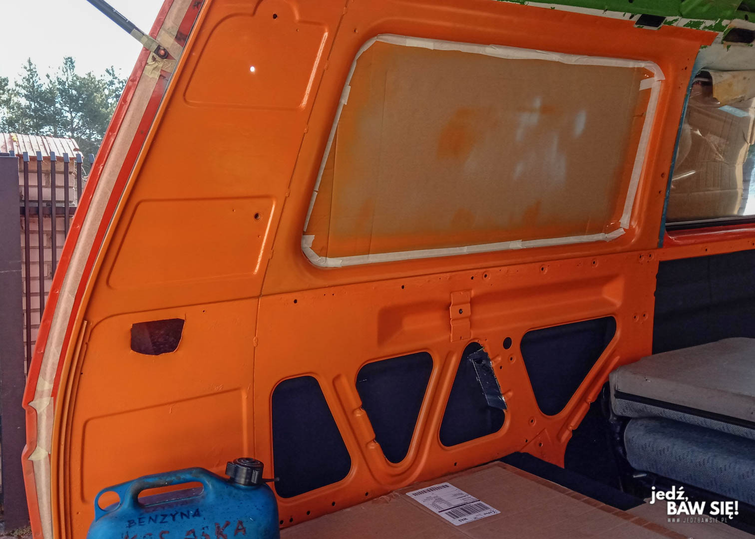 Plan był następujący: zaczynamy od jednego boku, żeby nauczyć się na czymś, co jest względnie nieskomplikowane w malowaniu, następnie przechodzimy na tył, wchodzimy na dach, na koniec zostawiając sobie drzwi przednie oraz front samochodu. Najprościej mówiąc – szliśmy od tyłu do przodu, po drodze przerabiając jeszcze dach, którego pozycja w harmonogramie zależała w dużej mierze od tego, kiedy zamierzaliśmy go ciąć (do tego jeszcze wrócimy). Z dachem trzeba zresztą było poczekać przynajmniej do czerwca, jako że wtedy to sakramenckie drzewa zza płotu miało najmniejszą tendencję do zrzucania czegokolwiek. Lakierowanie wnętrza było najmniej problematyczne, bo tu nie przeszkadzało nam praktycznie nic poza potrzebą wentylacji.
