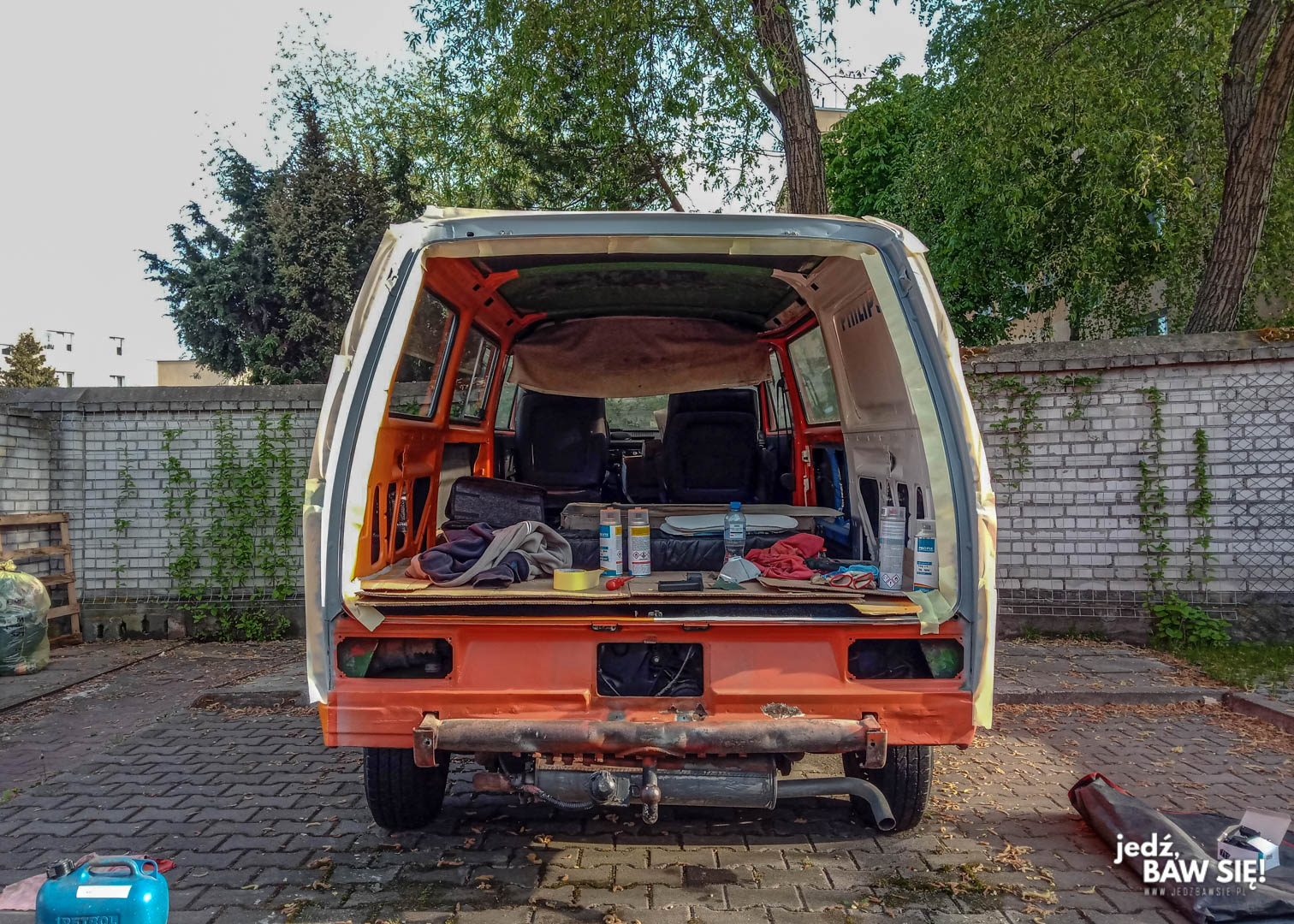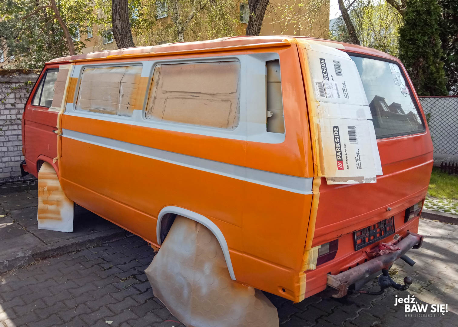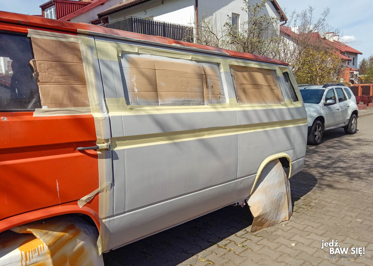 Nie posiadając garażu odpowiedniej wielkości, ani tym bardziej sporego, dobrze wentylowanego pomieszczenia, które mogłoby pełnić rolę komory lakierniczej, postawiliśmy na najbardziej straceńczą z możliwych lokalizacji lakierowania: placyk pod domem. Tak się składa, że nasza posesja jest ostatnia w rzędzie, a nasza ulica kończy się murem tuż pod naszymi oknami, dzięki czemu względnie bezkonfliktowo można tam ustawić samochód, który nikomu nie będzie przeszkadzał. Jako, że układ osiedla wygląda tak, a nie inaczej, bus mógł również stanąć w takim miejscu, że prace lakiernicze nie owocowały przy okazji niezamierzonym malowaniem pobliskich samochodów – ucierpieć mogła co najwyżej nawierzchnia.