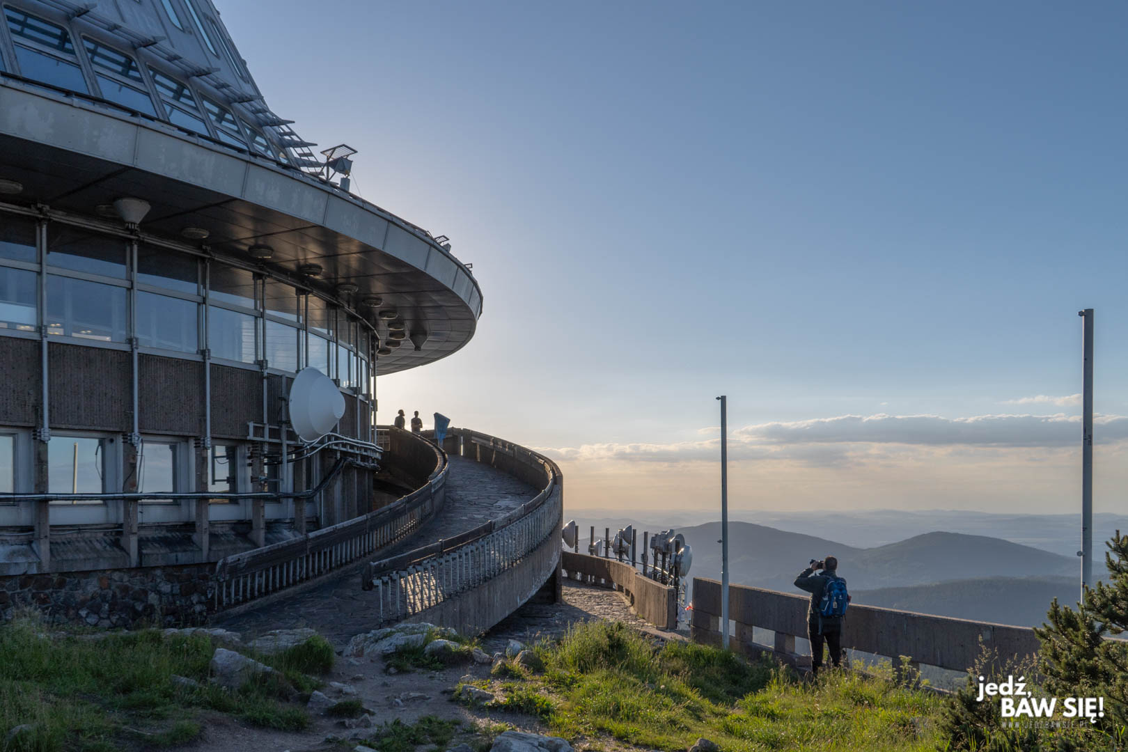 Budowla przypomina statek kosmiczny i najlepiej ogląda się ją ze średniej odległości, w drodze z parkingu (płatnego – 200 koron za samochód), oddalonego od niej o jakieś 20 minut szybkiego marszu pod górkę. Leniwce mogą skorzystać z kolejki linowej (150 koron w obie strony), która wysadza pasażerów pod samą budowlą. Z bliska widać wyraźnie, że hotel lata świetności ma już za sobą i człowiek nie chciałby stać pod nim podczas wichury – niektóre płyty wyglądają tak, jakby tylko czekały na pretekst, żeby odpaść i przeciąć kogoś na pół. Wnętrze robi odrobinę lepsze wrażenie, zwłaszcza jeśli ktoś lubi luksus w wydaniu późnokomunistycznym. W Czechosłowacji ewidentnie lubiano ciężkie, szklane kule i dowód na to widać tutaj na każdym kroku. Stronę internetową miejsca jako takiego znajdziecie tutaj.