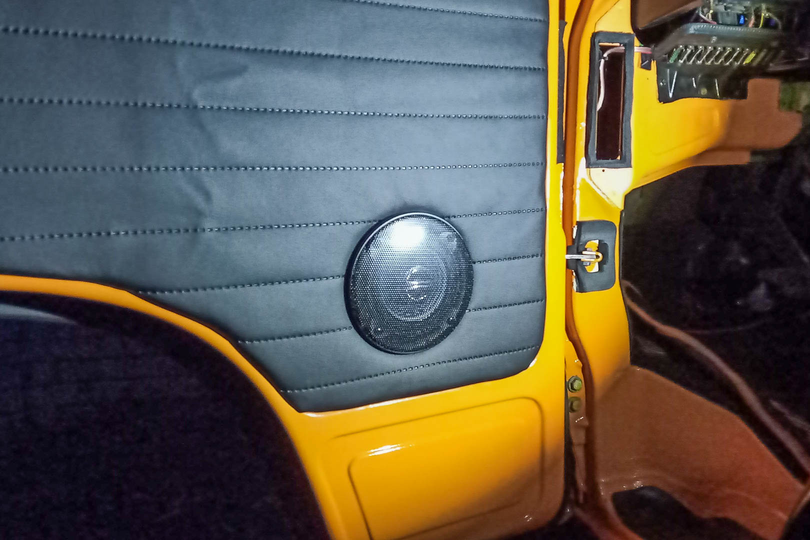 Z PRZEDNIMI głośnikami w Volkswagenie T3 jest trochę jak z radiem: ich rozmiar limitowany jest ilością miejsca. Tu są różne szkoły, które uczą, że głośniki przednie można zamontować w desce rozdzielczej (pomysł raczej słaby, jako że ta jest „otwarta” od dołu) albo w jednym z paru miejsc na drzwiach przednich, włączając w to oryginalne otwory głośnikowe w ich dolnej części. My wybraliśmy ten ostatni wariant, nie chcąc za bardzo kombinować z miejscem na górze, często kolidującym z korbką do otwierania szyb (jeśli ktoś ma szyby otwierane automatycznie, to jest to jednak miejsce bardziej optymalne, bo bliższe ucha).