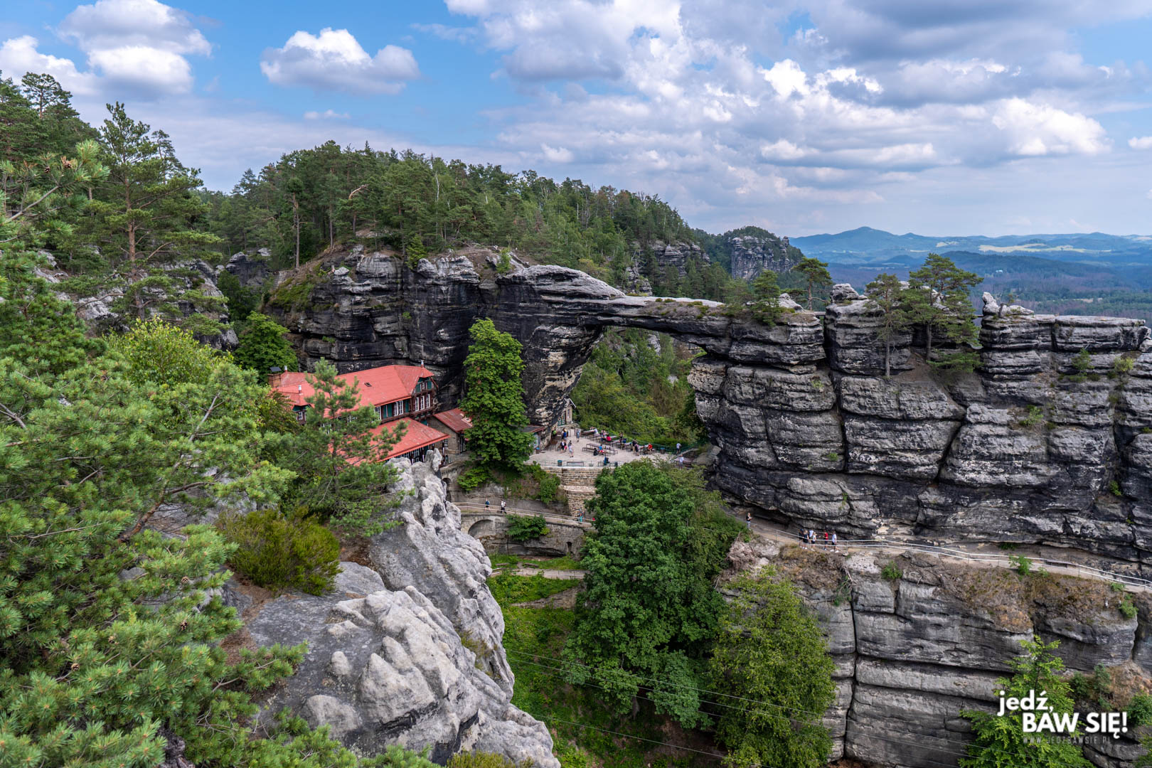 Kiedy na trasie zobaczycie więcej kamieni niż drzew, to będzie to wyraźny sygnał, że dochodzicie do celu. Wkrótce, po wyjściu zza załomu skalnego, Waszym oczom ukaże się Pravcicka Brama oraz – na lewo od niej – Sokole Gniazdo.