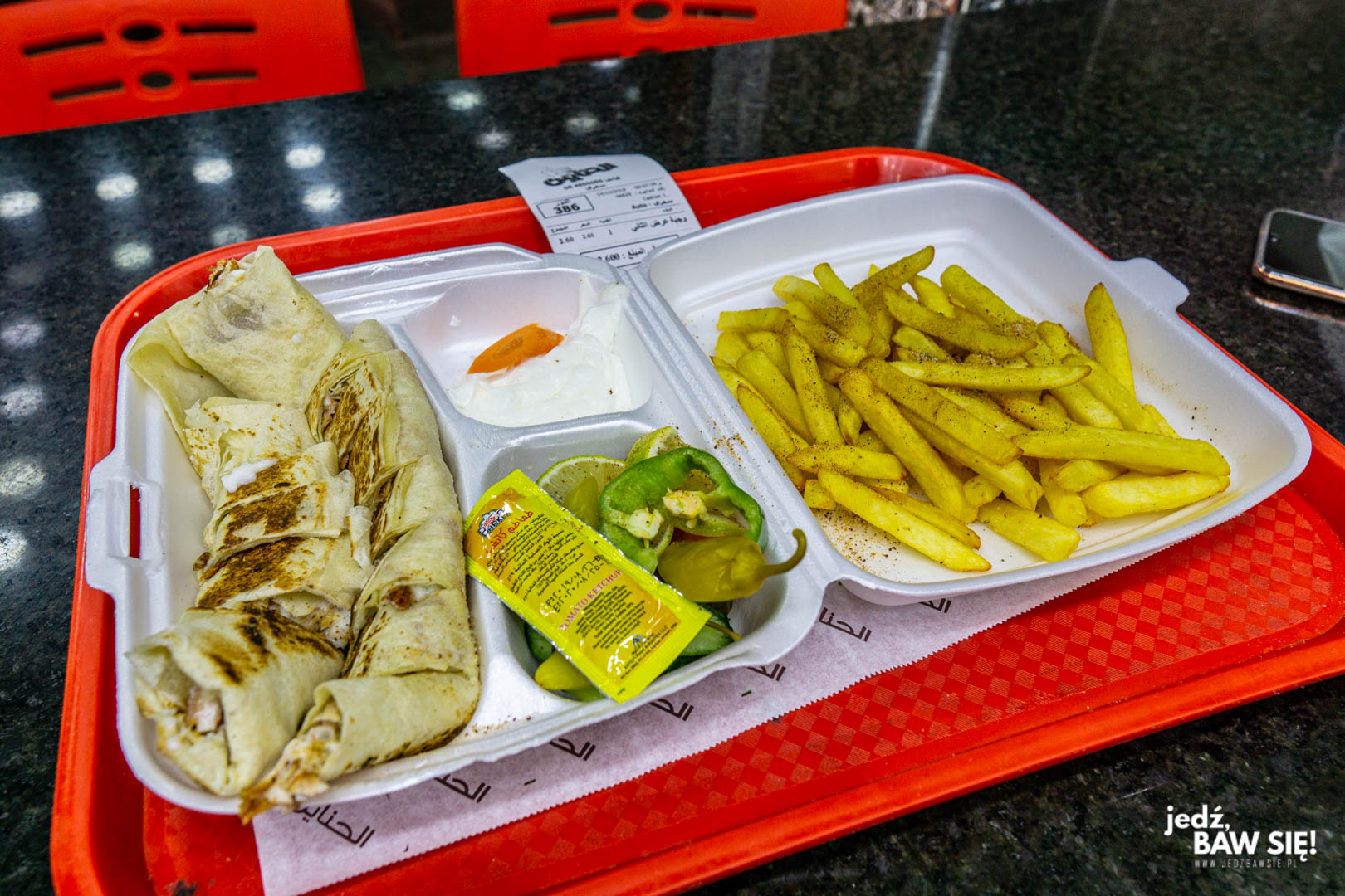 Z kwestią oszczędności wiąże się również zagadnienie jedzenia. W tym miejscu potraktuję sprawę skrótowo i napiszę tylko, że już od pierwszych dni na miejscu warto stołować się w mniejszych knajpkach dla localsów, zadowalając się nieco częściej zwykłą szoarmą czy kebabem, a rzadziej bardziej wymyślnymi, tradycyjnymi potrawami regionu. Takie podejście będzie każdorazowo zostawiać Wam w kieszeni nawet po 10 JOD, co na pewno przełoży się na DUŻO niższe koszty wyjazdu. Przykładowo, niewielki obiad (BEZ PIWA!) na Rainbow Street w Ammanie kosztował nas 15 JOD (z wliczonym podatkiem i service fee w wysokości 10%), a dwa razy większa (i smaczniejsza) szoarma w knajpie pod hotelem – zaledwie 2,5 JOD. Dość powiedzieć, że my sami przez większość wyjazdu przygotowywaliśmy sobie śniadania sami (do teraz nie mogę patrzeć na hummus), a w porze obiadowej szukaliśmy małych knajp oznaczonych symbolem mieszanki kebabowej na patyku. Plus jest taki, że dało się je znaleźć nawet na największych zadupiach.