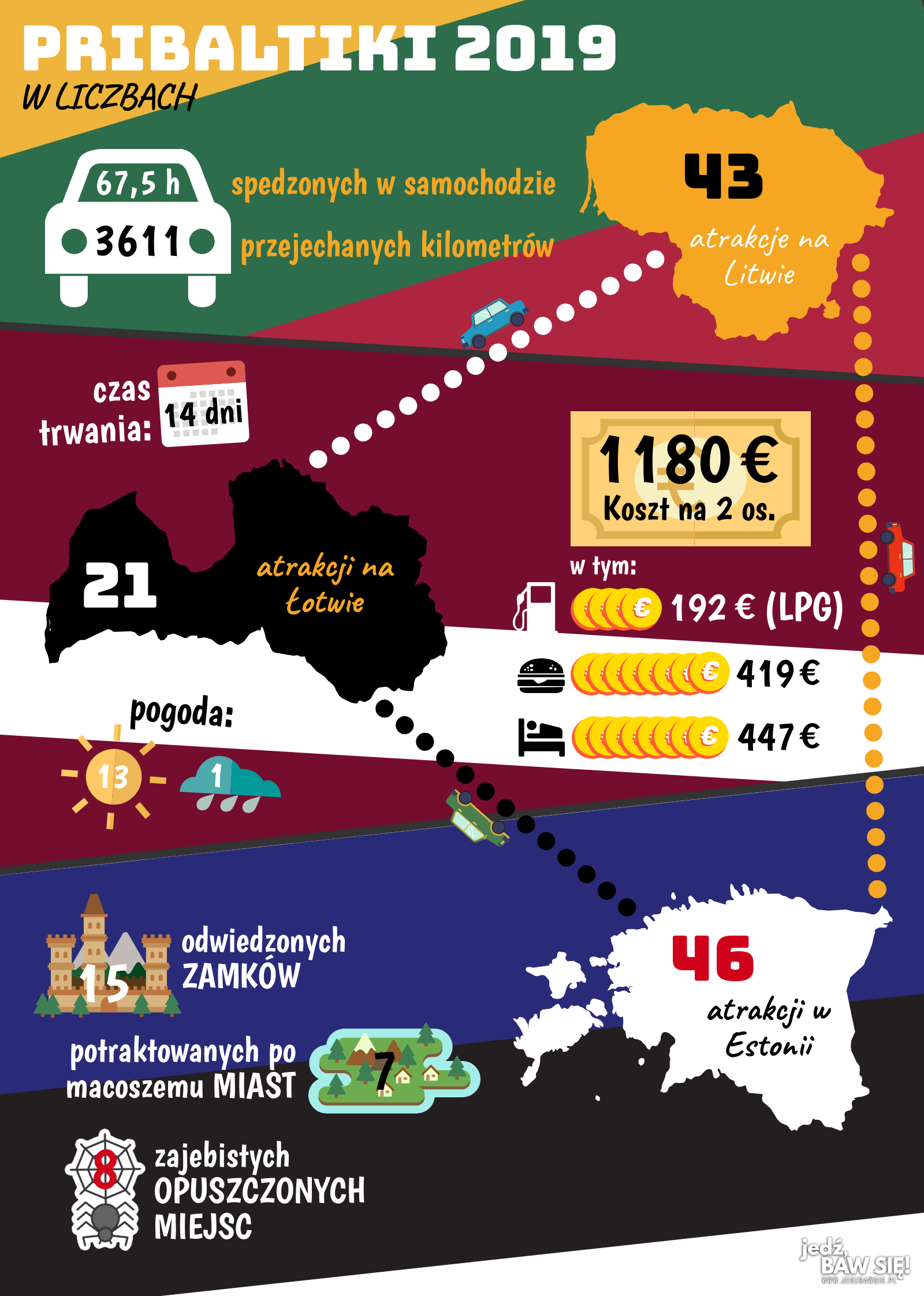 O transport zadbaliśmy samodzielnie, pożyczając Dacię Duster moich rodziców. Mój bus jeszcze nie był zdatny do jazdy, a wysoko zawieszony, wyposażony w instalację gazową SUV wydawał się idealnym rozwiązaniem na pribaltyckie szlaki. Wytrzymałość dusterowego zawieszenia doceniliśmy zwłaszcza na Łotwie, gdzie drogi daleko odbiegają od europejskich standardów, a także w co bardziej odosobnionych rejonach pozostałych krajów. Samochód przez cały urlop jeździł na gazie, co – w połączeniu ze średnią prędkością 85 km/h – znacznie przyczyniło się do obniżenia kosztów całej wycieczki.